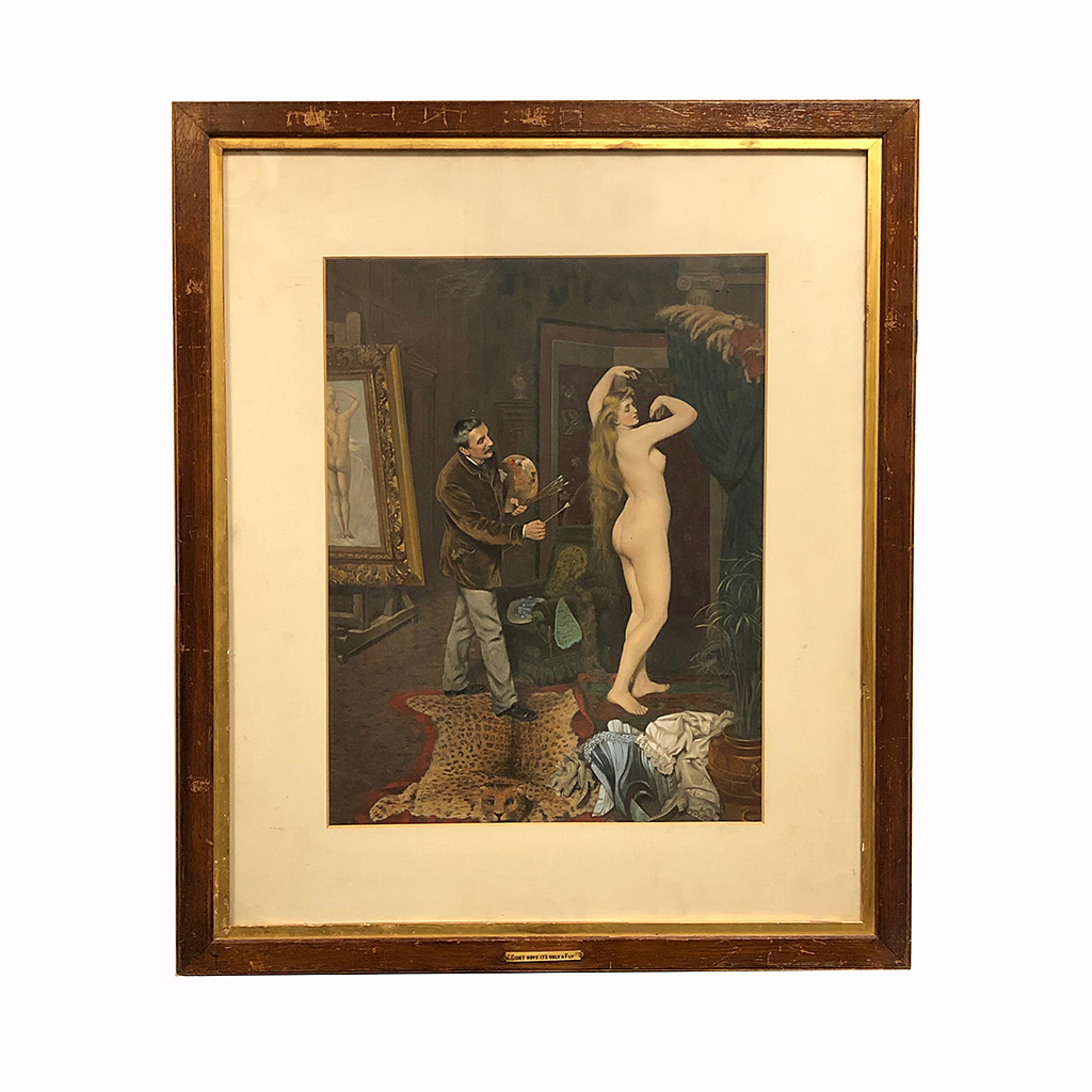 VICTORIAN COLOUR PRINT OF AN ARTIST WITH NUDE MODEL /iDON'T MOVE IT'S ONLY A FLY/i BY FRANK HYDE IN AN OAK FRAME 31/i X 26/i