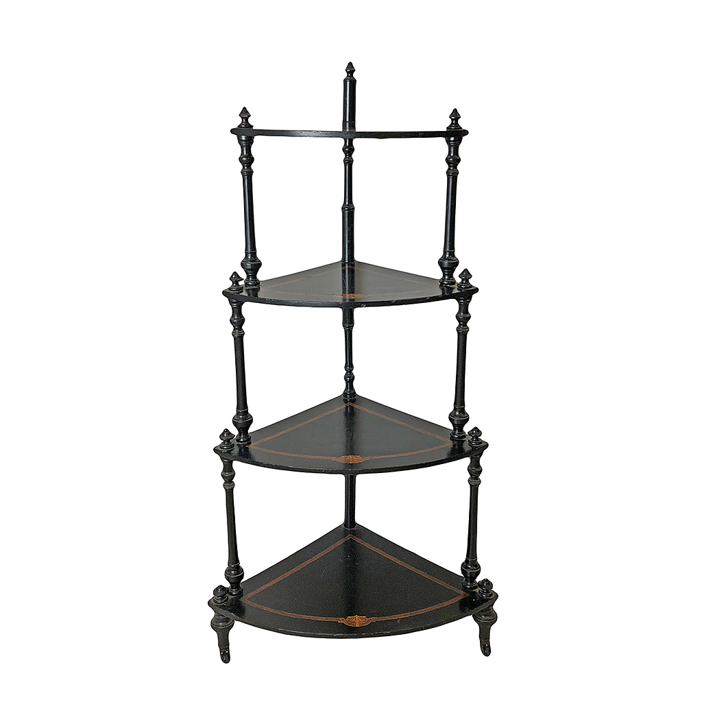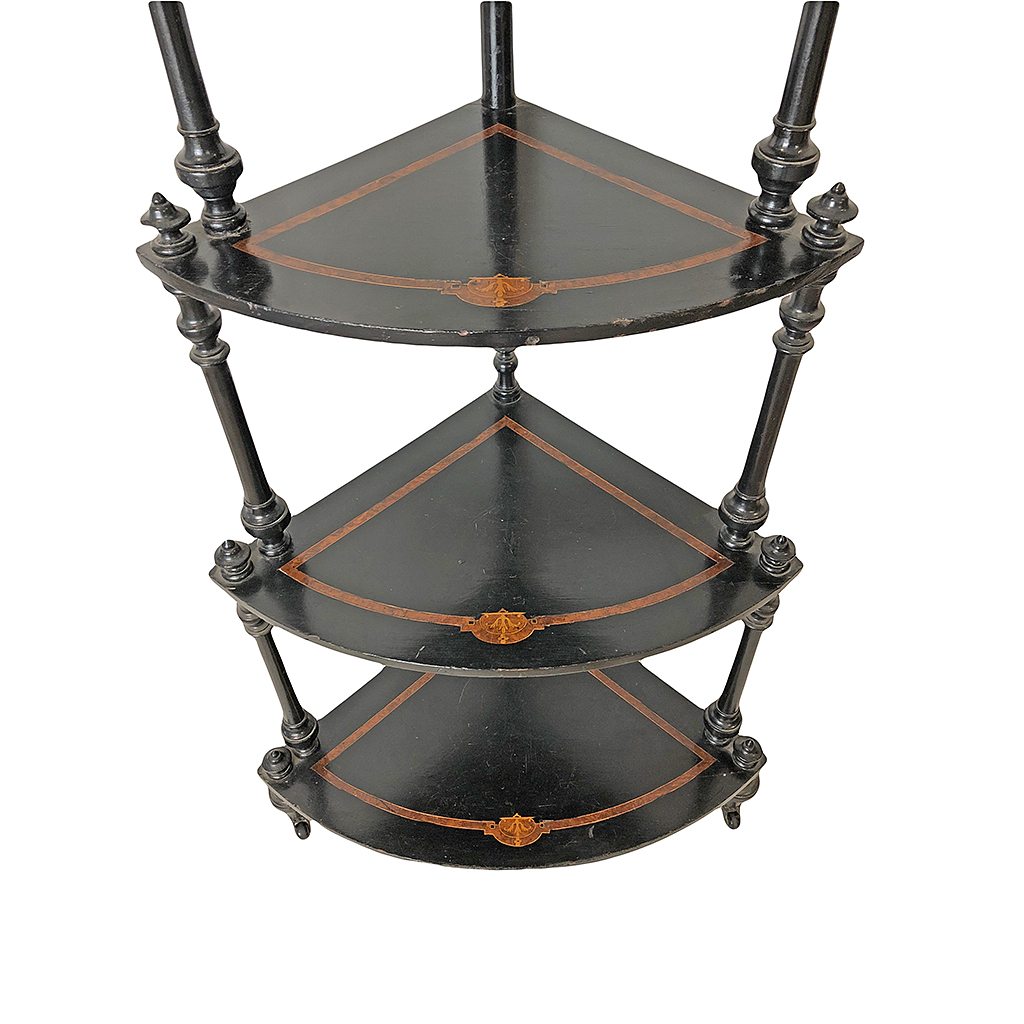VICTORIAN CORNER WHATNOT SHELVES BLACK LACQUER WITH TERRACOTTA PIPING