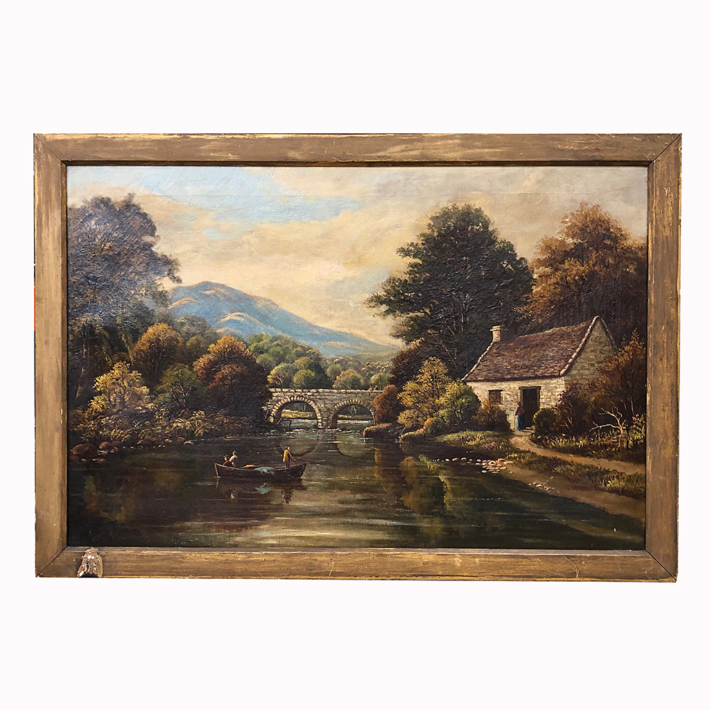 VICTORIAN ENGLISH LANDCAPE OIL PAINTING RIVER SCENE WITH A STONE BRIDGE AND COTTAGE IN A 1.5" SIMPLE GILT FRAME 24" X 36"