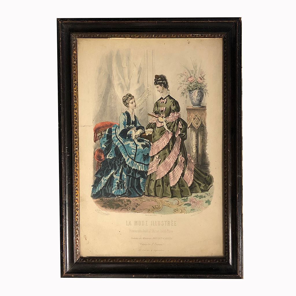 VICTORIAN FASHION PRINT IN A BLACK FRAME WITH GILT SLIP 17/i X 14/i