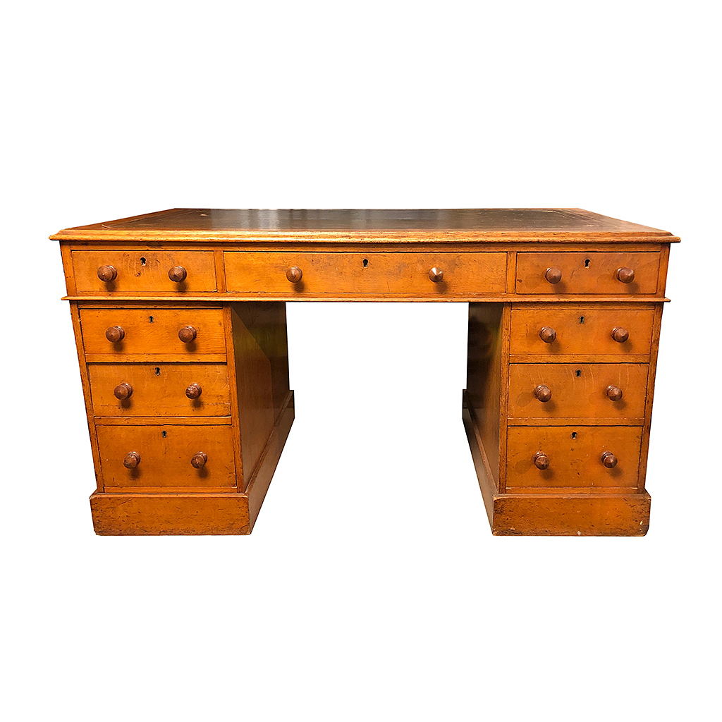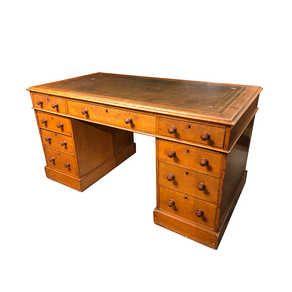 VICTORIAN LIGHT OAK PEDESTAL DESK WITH A TOOLED GREEN LEATHER TOP AND KNOB HANDLES 71 CM HIGH 135 CM WIDE 71 CM DEEP