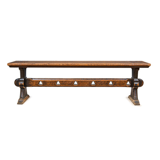 VICTORIAN OAK BENCH WITH SHAPED ENDS THE STRECHER WITH PUNCHED TREFOILS CIRCA 1870 45 CM HIGH 153 CM LONG 30 CM DEEP (X3)