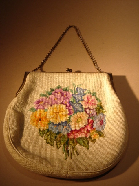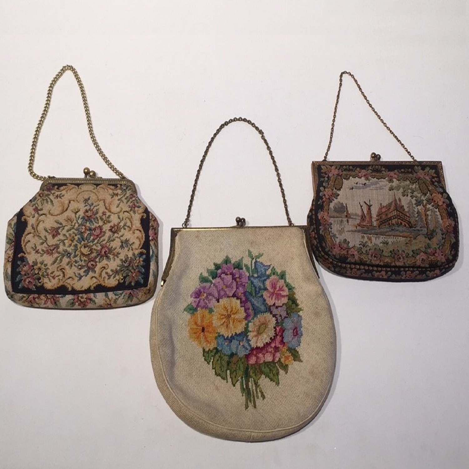 VICTORIAN PETIT POINT NEEDLEWORK HANDBAG WITH A GILT METAL TOP AS LISTED