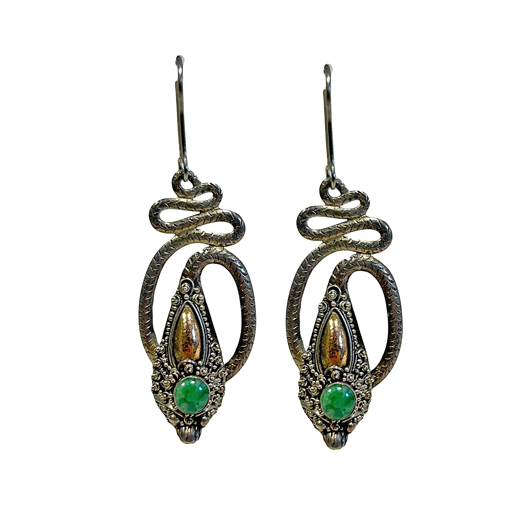 VICTORIAN SILVER EARRINGS IN A SHAPE OF A SNAKE WITH SMALL GODL DROP AND JADE STONE
