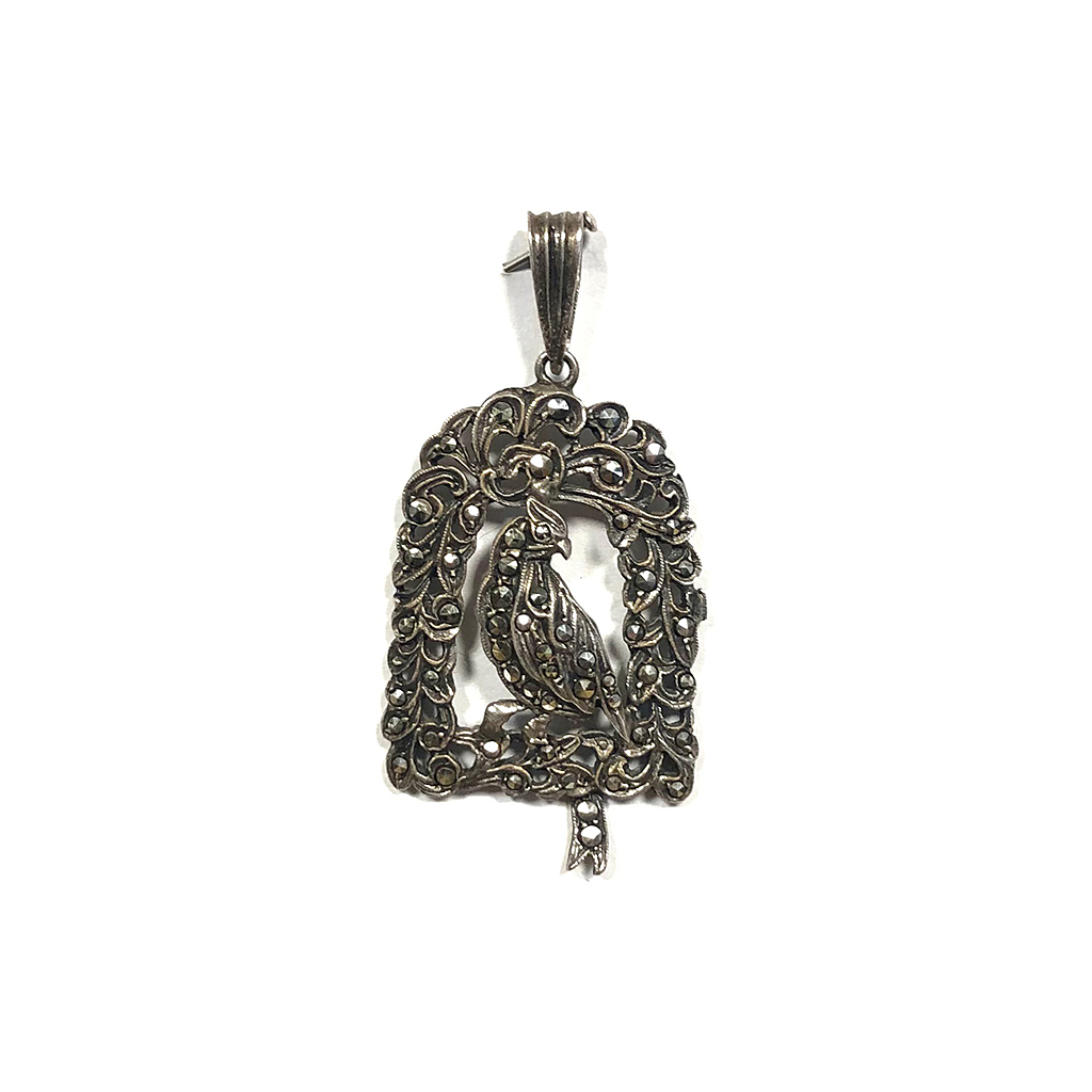 VICTORIAN SILVER AND MARCASITE PENDANT CAGE AND BIRD DESIGN