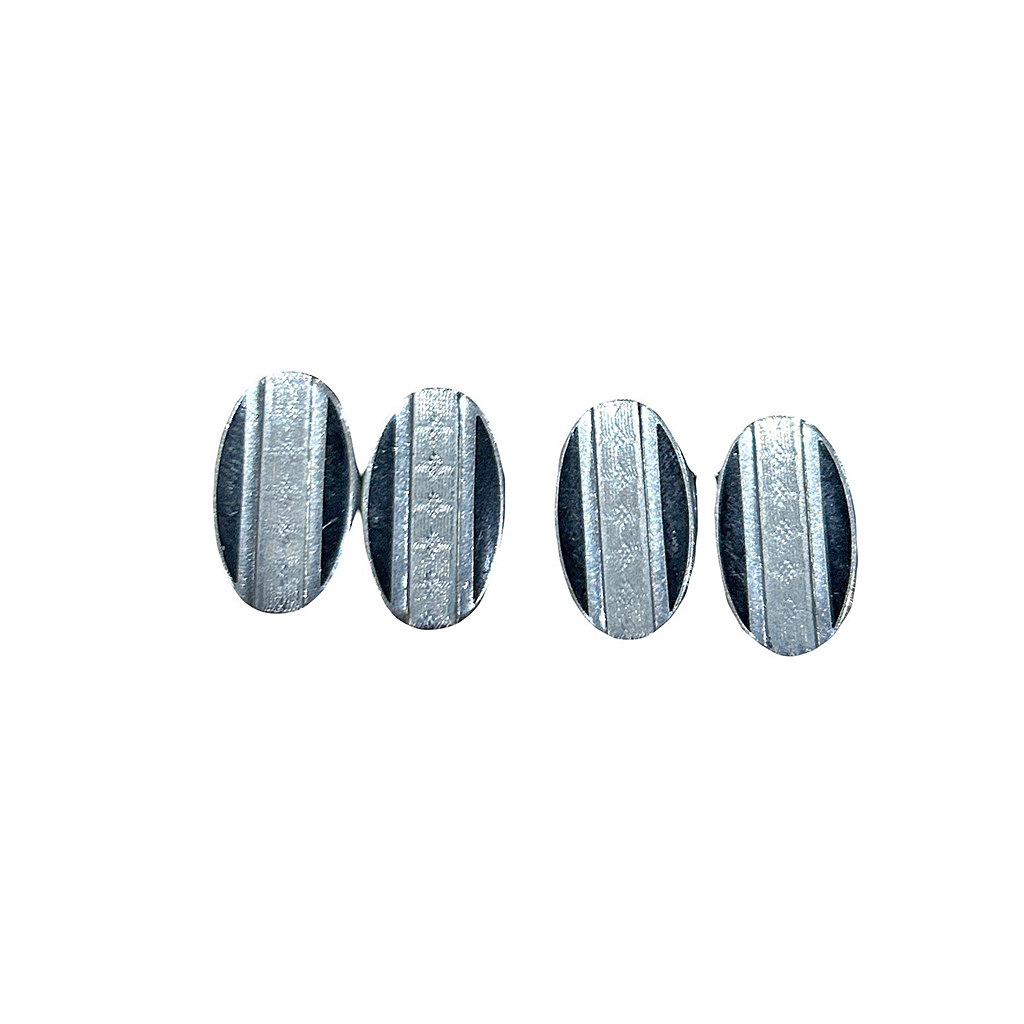 VICTORIAN SILVER PLATED OVAL CUFFLINKS WITH DECORATIVE STRIPE DESIGN WITH BLACK STRIPE JET
