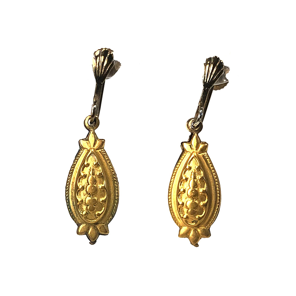 VICTORIAN SMALL PINCHBECK DROP EARRRINGS WITH FLORAL RELEAF DESIGN
