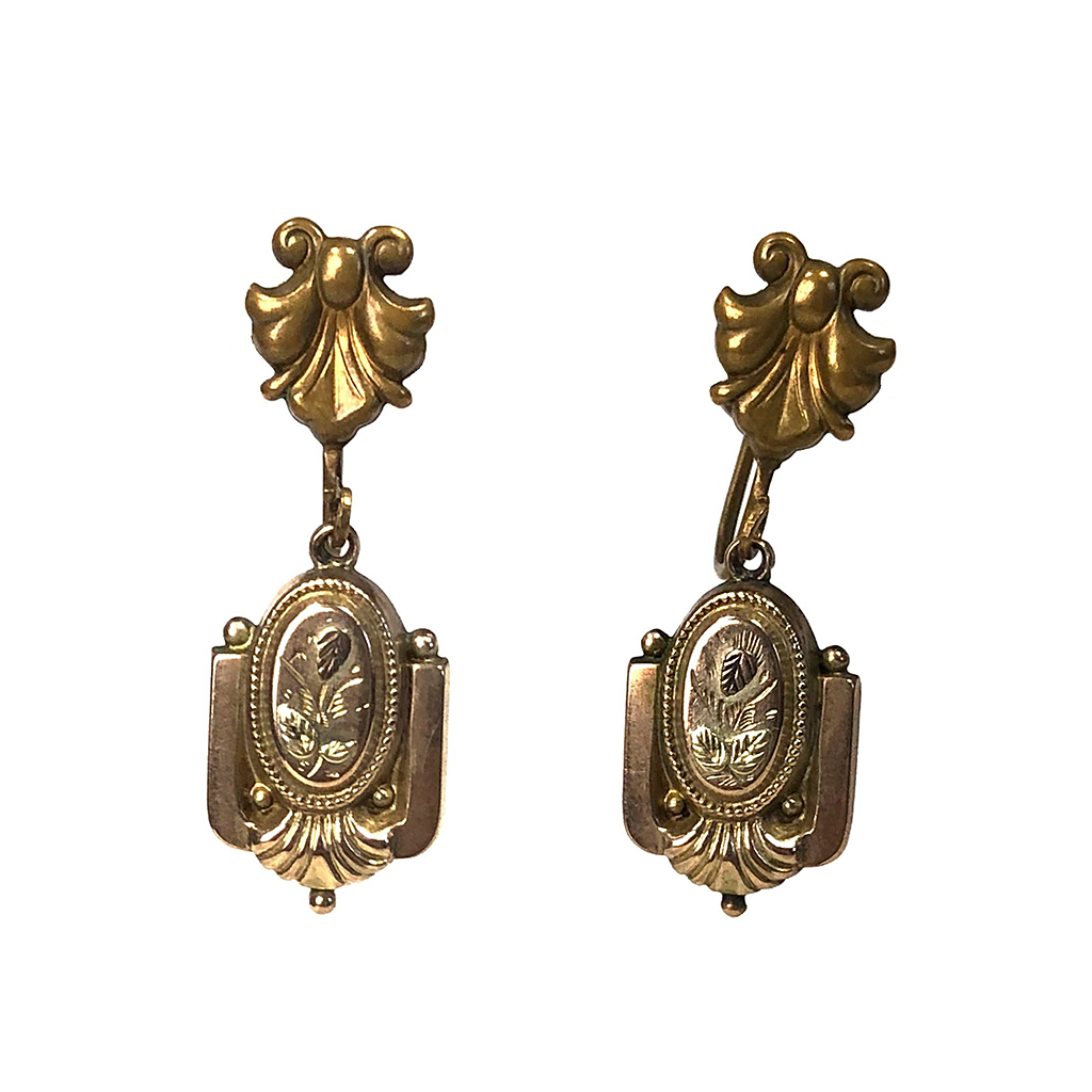 VICTORIAN SMALL PINCHBECK EARRINGS RECTANGULAR WITH ENGRAVED FLORAL DECORATION