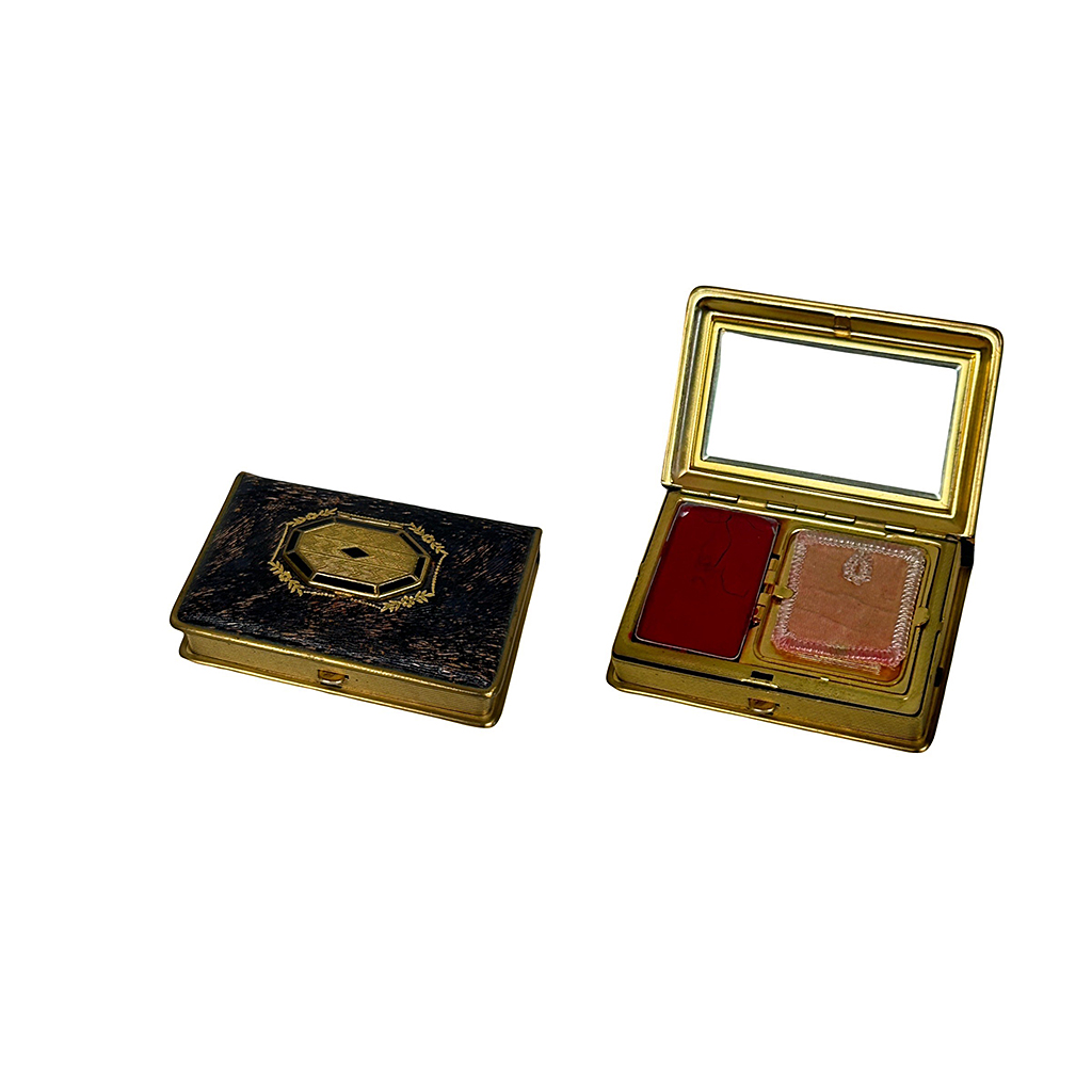VINTAGE SMALL RECTANGULAR BRASS AND LEATHER COMPACT BY ''MONDAINE'' WITH TOP SMALL LIPSTICK COMPARTMENT 7.5 CM X 5 CM