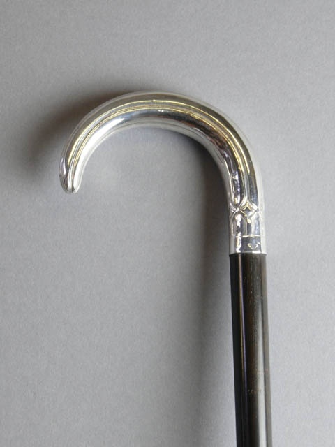 WALKING STICK / CANE EBONISED SILVER GOTHIC DESIGN CROOK HANDLED 92 CM LONG
