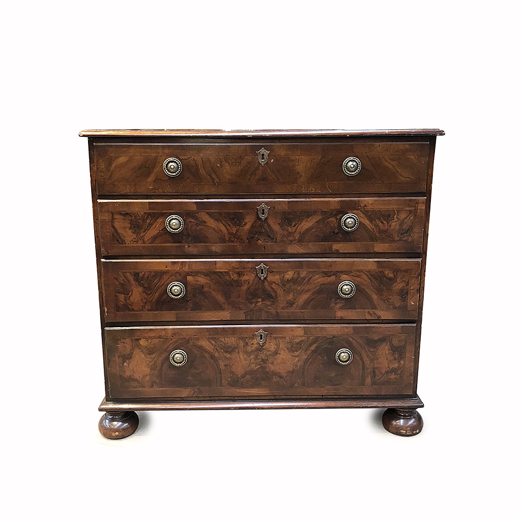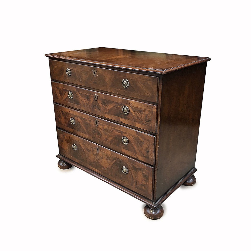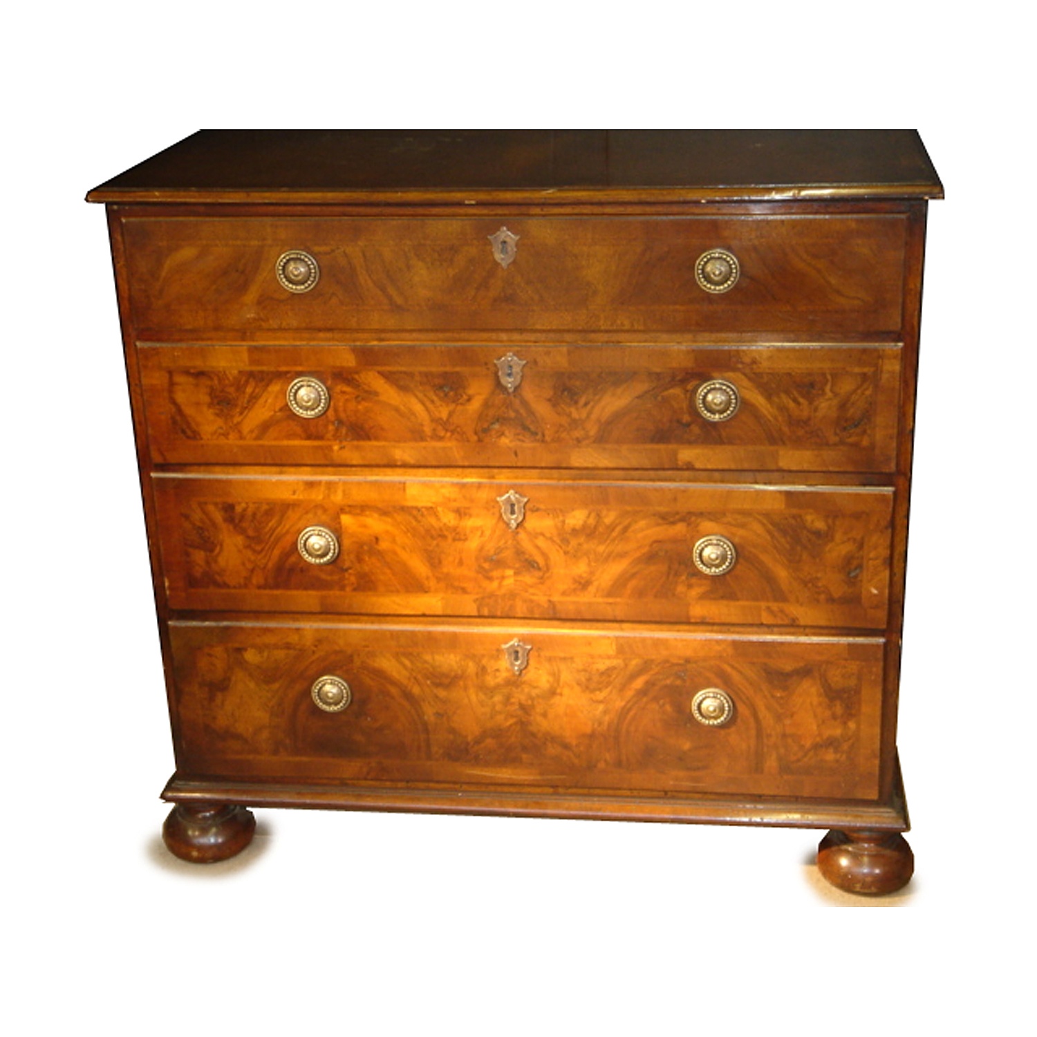 WALNUT SMALL CHEST OF DRAWERS WITH BUN FEET BRASS RING HANDLES 87 CM HIGH 94 CM WIDE 53 CM DEEP