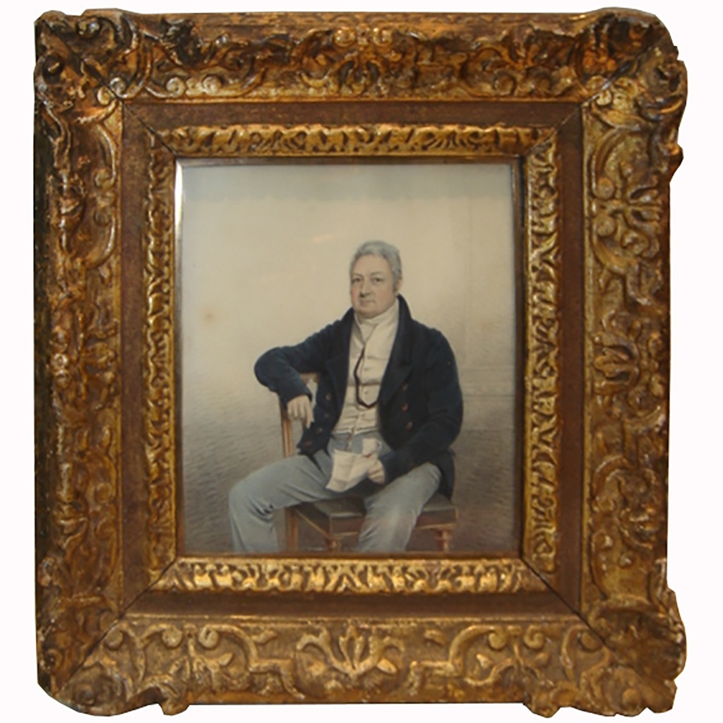 WATERCOLOUR 7/i X 6/i PORTRAIT OF A SEATED VICTORIAN GENTLEMAN IN CARVED GILT FRAME