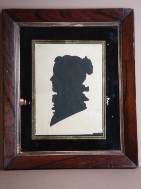 WATERCOLOUR 8" X 6" SILHOUETTE OF A LADY IN A POLISHED OAK FRAME WITH BLACK AND GOLD GLASS