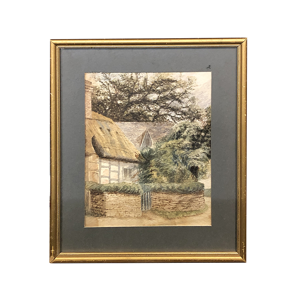 WATERCOLOUR 9" X 7" A THATCHED COTTAGE IN AN ENGLISH VILLAGE IN A GILT FRAME WITH A DARK TAN MOUNT