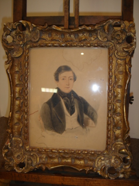 WATERCOLOUR 9/i X 7/i PORTRAIT OF A VICTORIAN GENTLEMAN IN A HEAVY CARVED GILT SWEPT FRAME