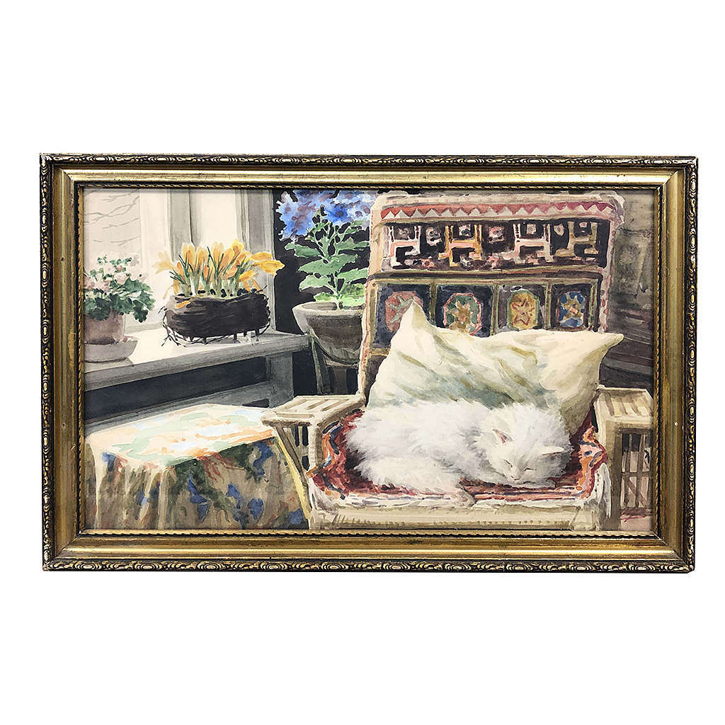 WATERCOLOUR A WHITE KITTEN ASLEEP ON A BRIGHTLY COLOURED CHAIR BY A WINDOW IN A GILT FRAME 11" X 16"
