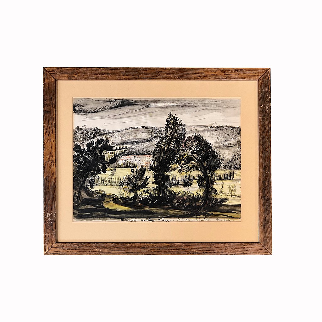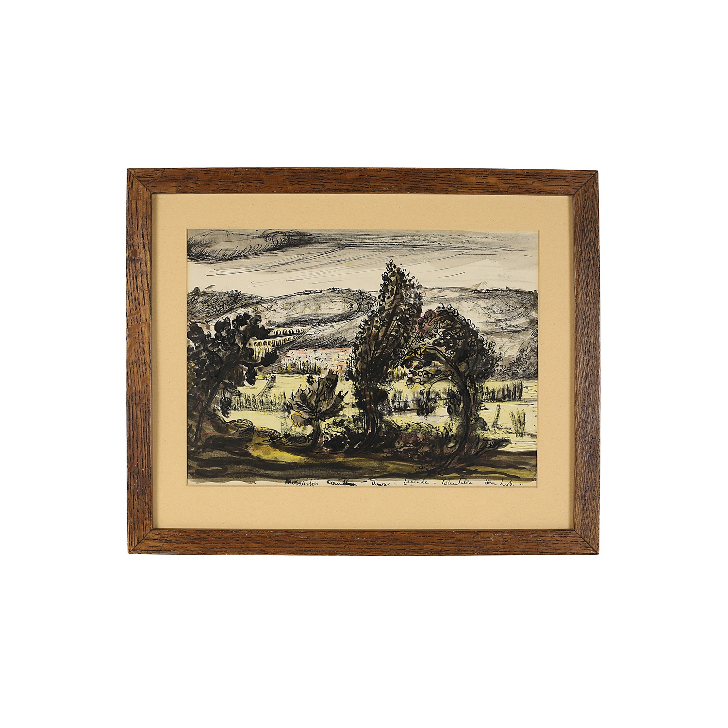 WATERCOLOUR AND INK MODERN FRENCH LANDSCAPE IN A DARK OAK FRAME 11/i X 14/i WITH A CREAM MOUNT