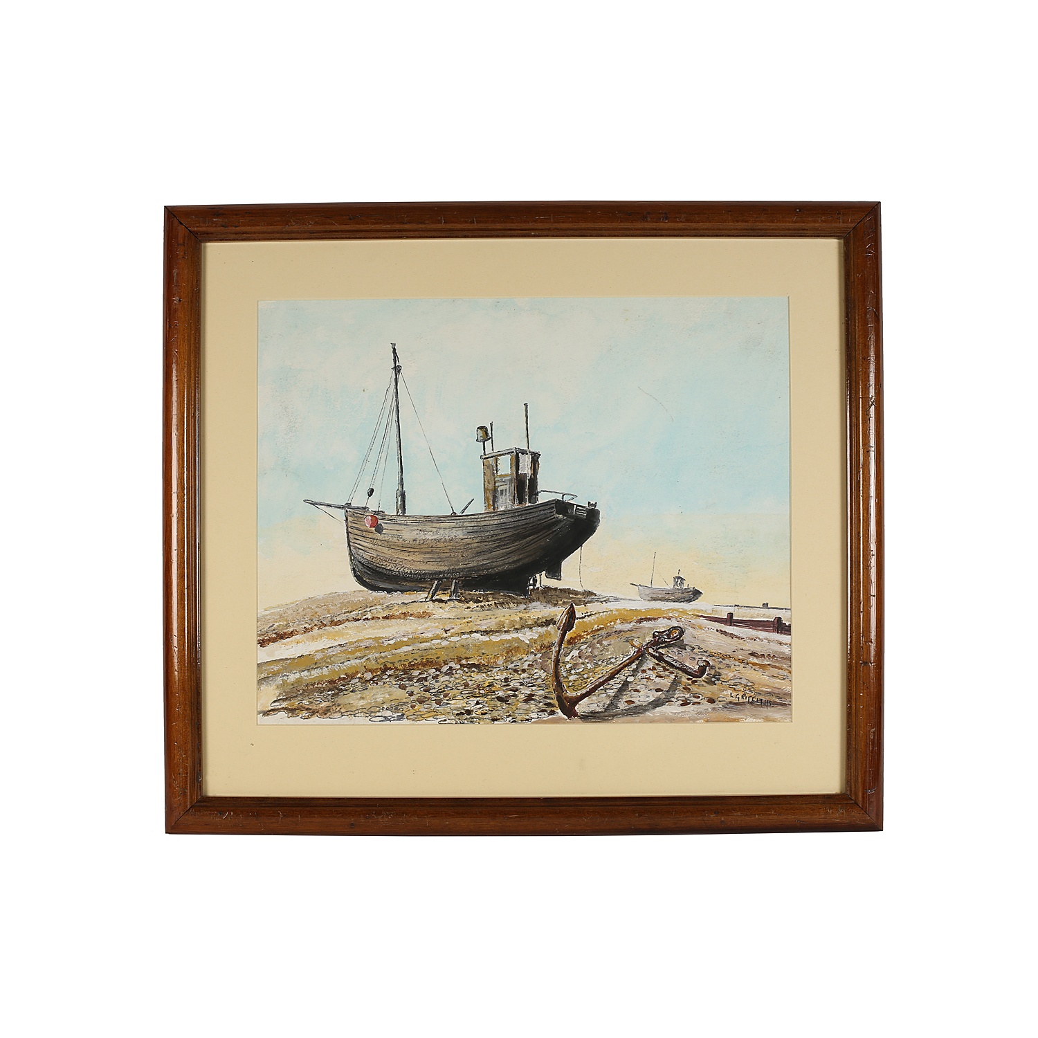 WATERCOLOUR BEACHED FISHING BOATSIN A BROWN CUSHION FRAME 14/i X 17/i