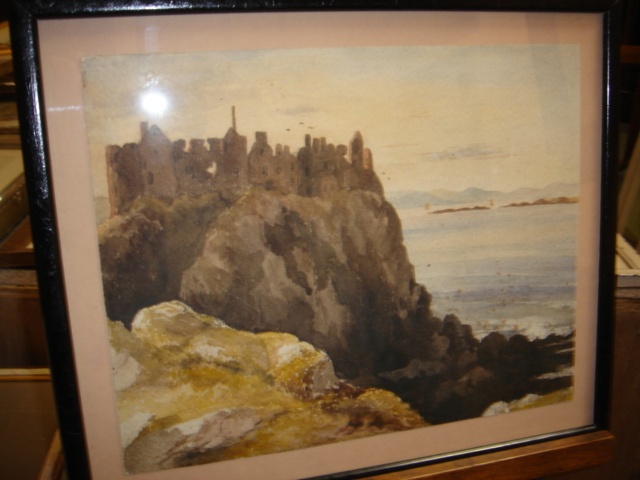 WATERCOLOUR CASTLE RUINS ON A CLIFF EDGE IN A BLACK FLAT FRAME 9/i X 11/i