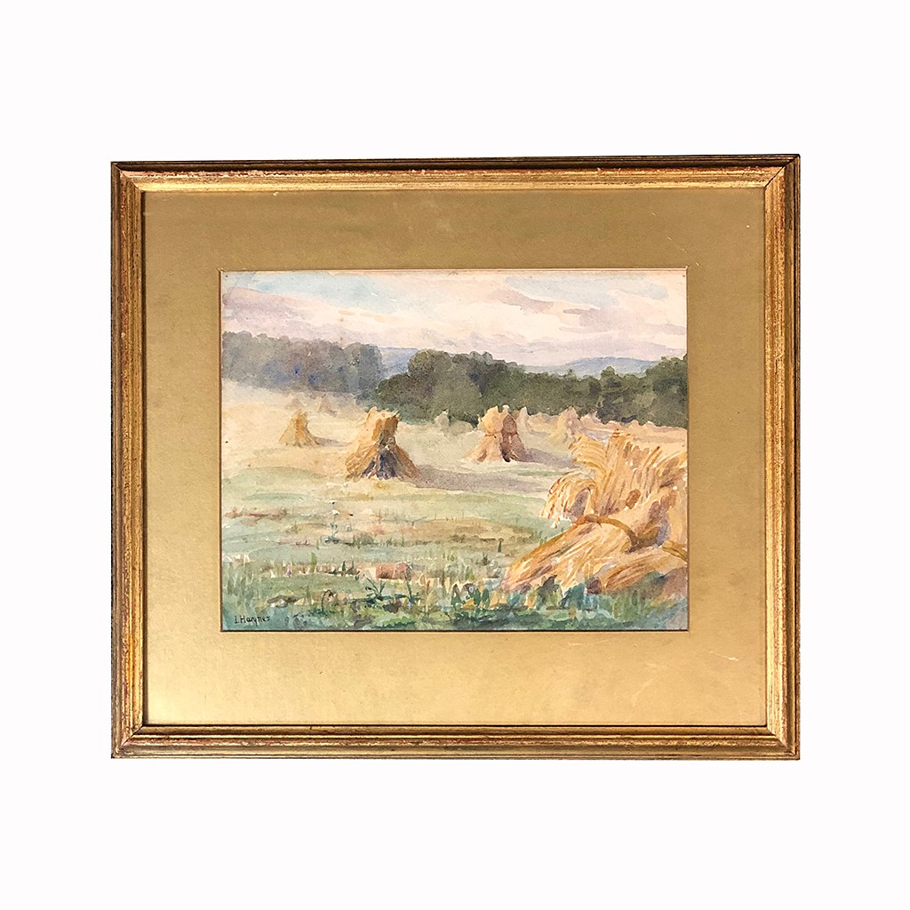 WATERCOLOUR ENGLISH LANDSCAPE WITH A CORNFIELD IN A REVERSE GILT FRAME 9/i X 11/i WITH A GOLD MOUNT