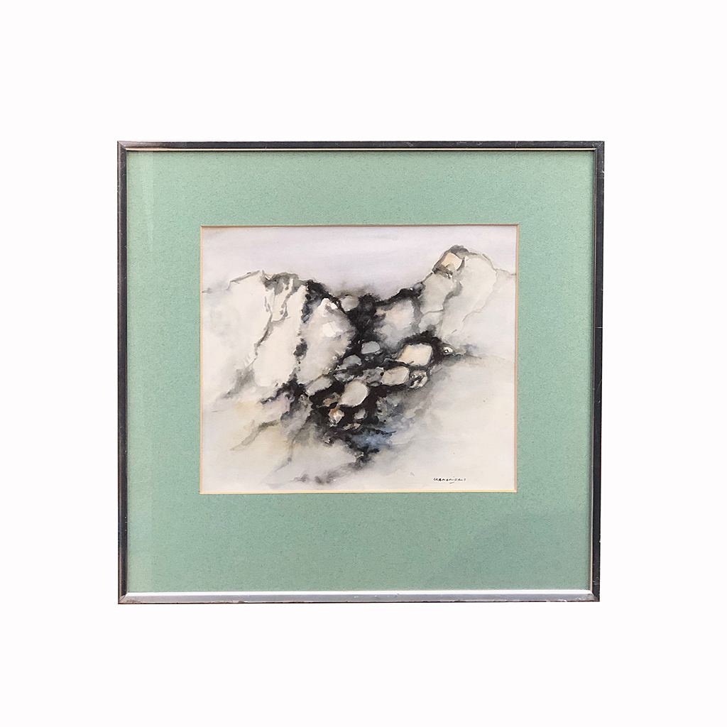 WATERCOLOUR MODERN LANDSCAPE BY ROGER CLAMAGIRAND (1920-1979) /i SERIES VI NO1 /i IN A STEEL FRAME 15/i X 16/i WITH A PALE GREEN MOUNT