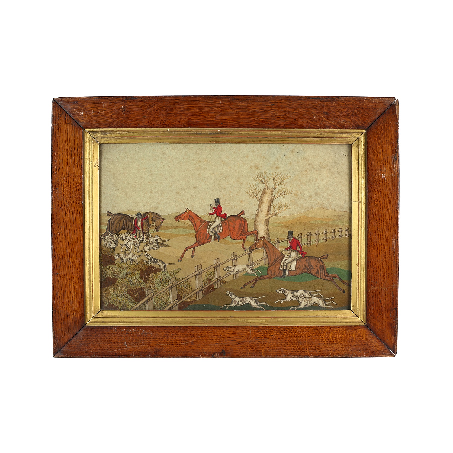 WATERCOLOUR ON CLOTH 12/i X 18/i HUNTING SCENE IN WIDE OAK FRAME