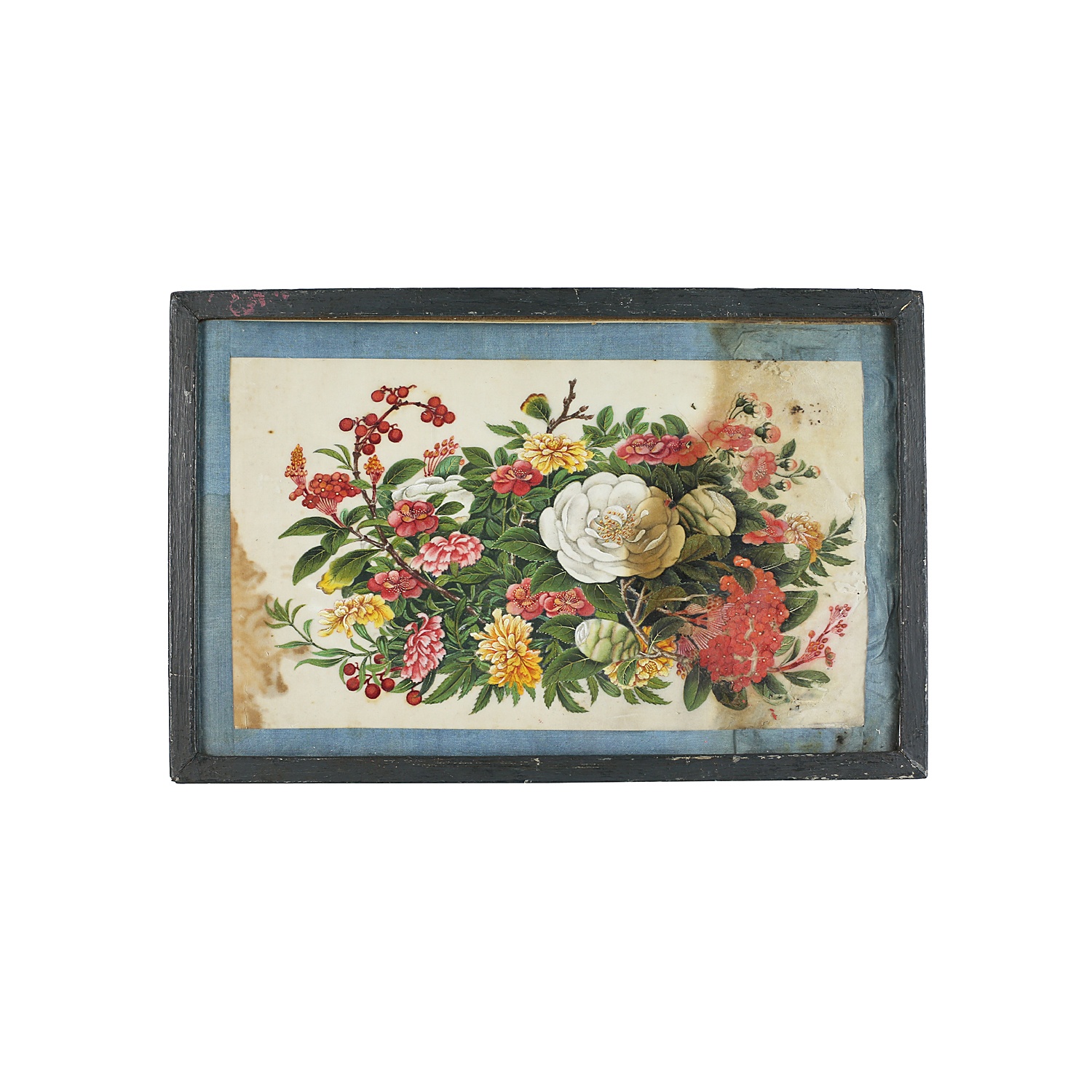 WATERCOLOUR ON SILK 7/i X 11/i CHINESE FLOWERS IN A GREY FRAME