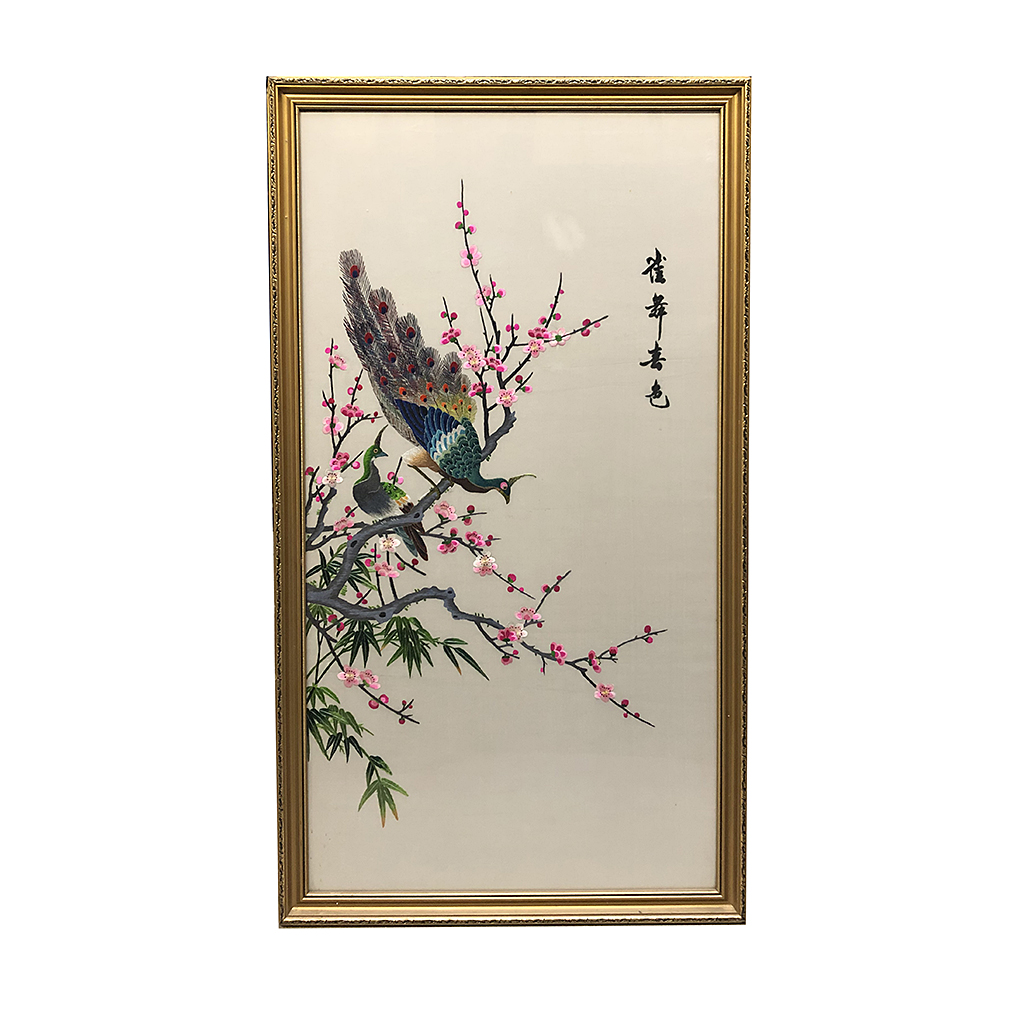 WATERCOLOUR ON SILK CHINESE BIRDS IN A GILT FRAME 39" X 21"