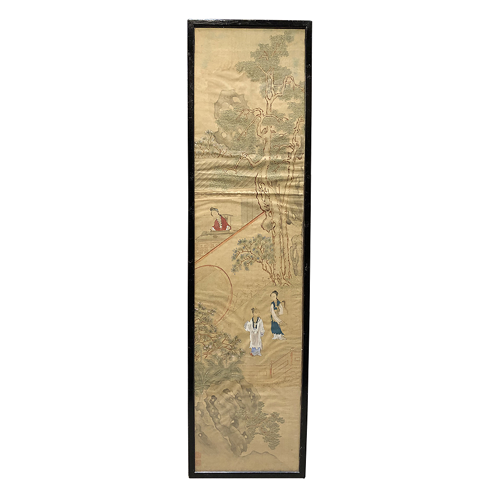 WATERCOLOUR ON SILK CHINESE FIGURES IN A BLACK FRAME 51" X 12"