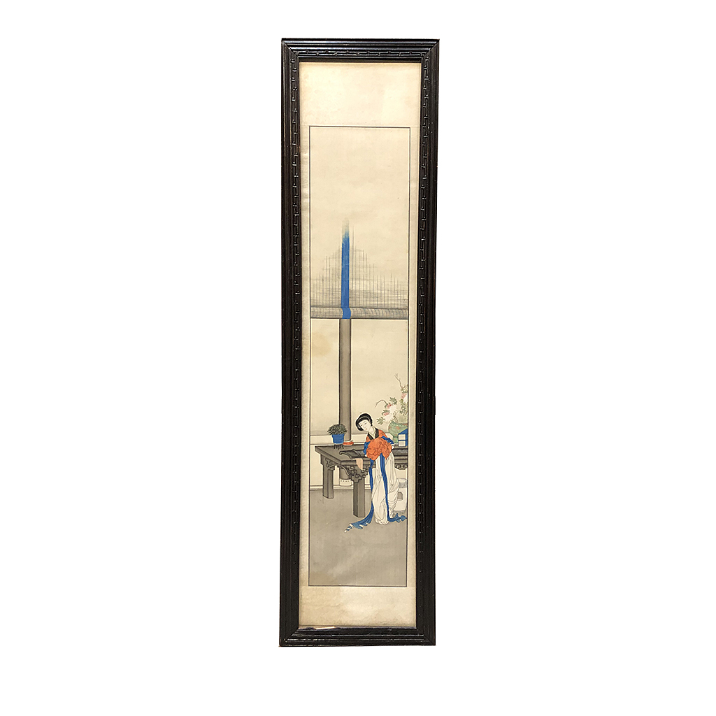 WATERCOLOUR ON SILK CHINESE FIGURES IN A POLISHED WOOD FRAME 43" X 9"