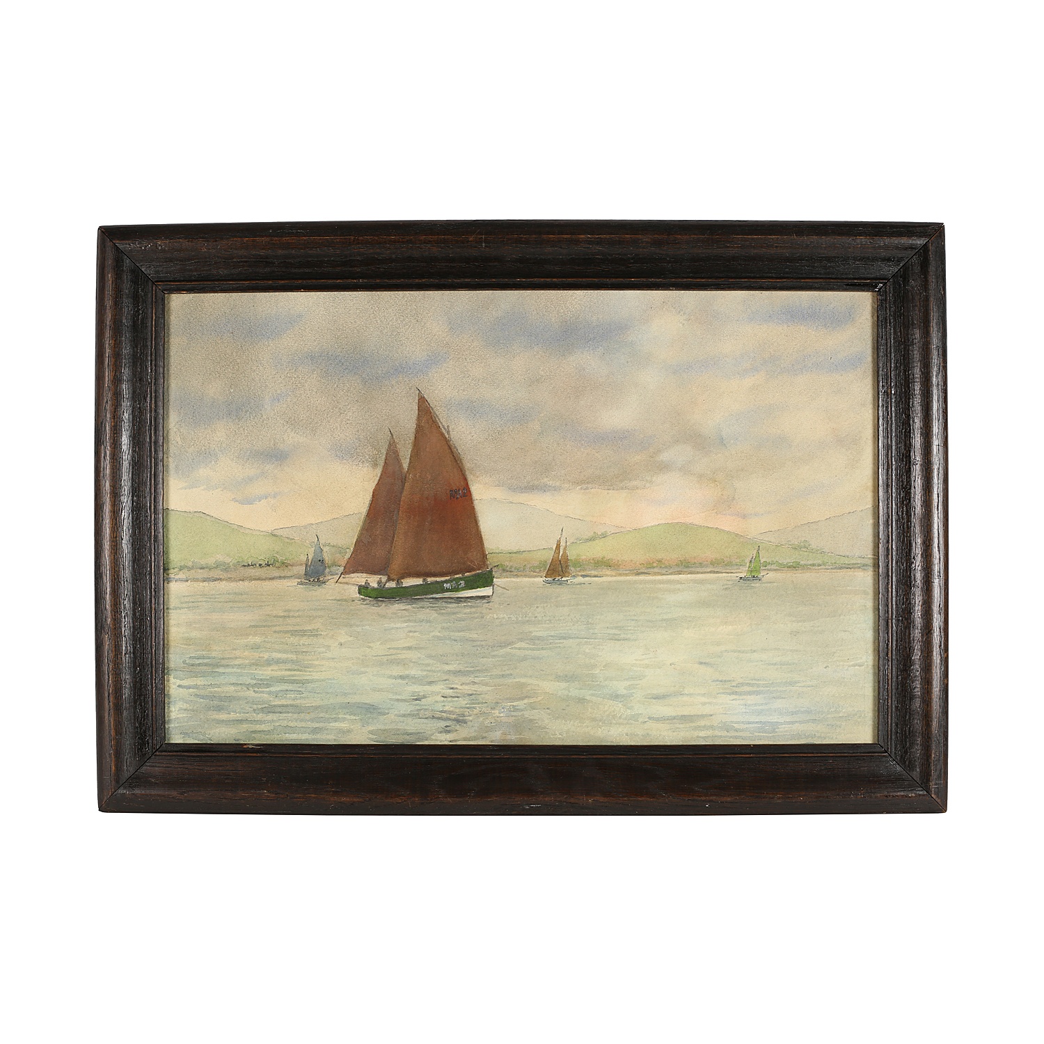 WATERCOLOUR SAILING BOATS ON AN ENGLISH LAKE EARLY 20THC IN A 2/i REVERSE OAK FRAME 12/i X 19/i