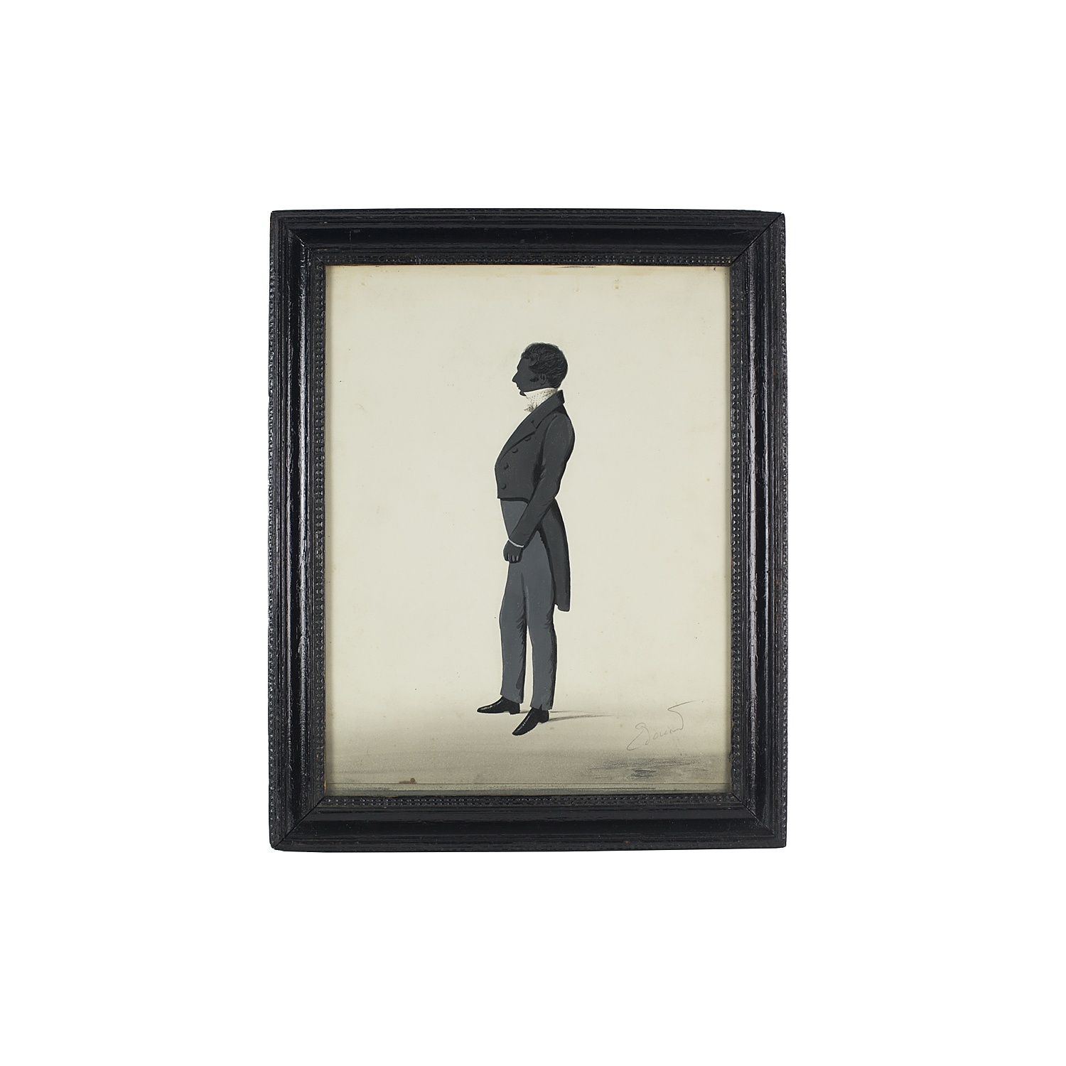 WATERCOLOUR SILHOUETTE IN SHADES OF GREY FULL LENGTH PORTRAIT OF AN EARLY VICTORIAN GENTLEMAN IN A BLACK FRAME 11/i X 8/i