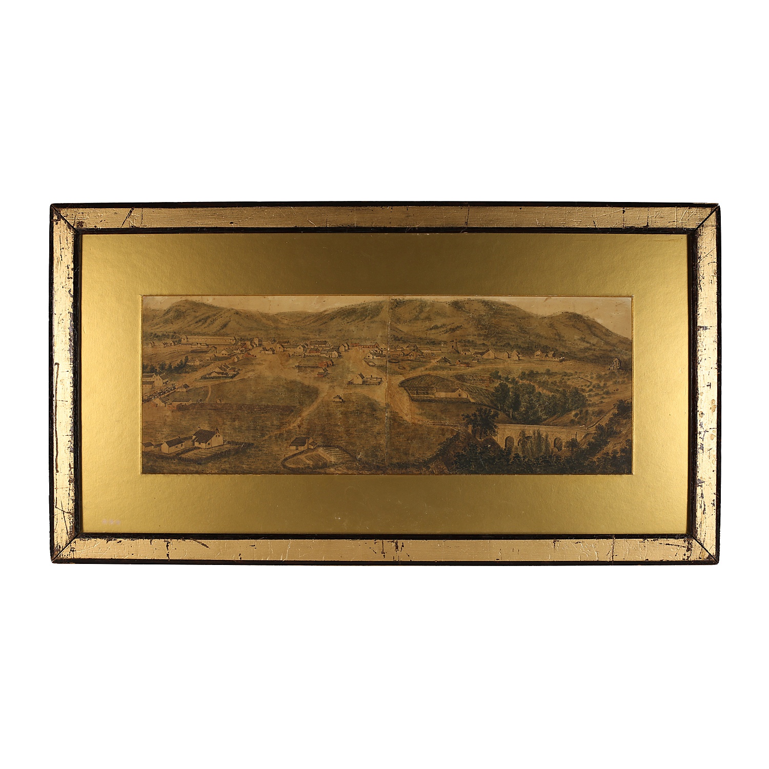 WATERCOLOUR SOUTH AFRICAN SETTLEMENT IN A GILT FRAME 8/i X 22/i