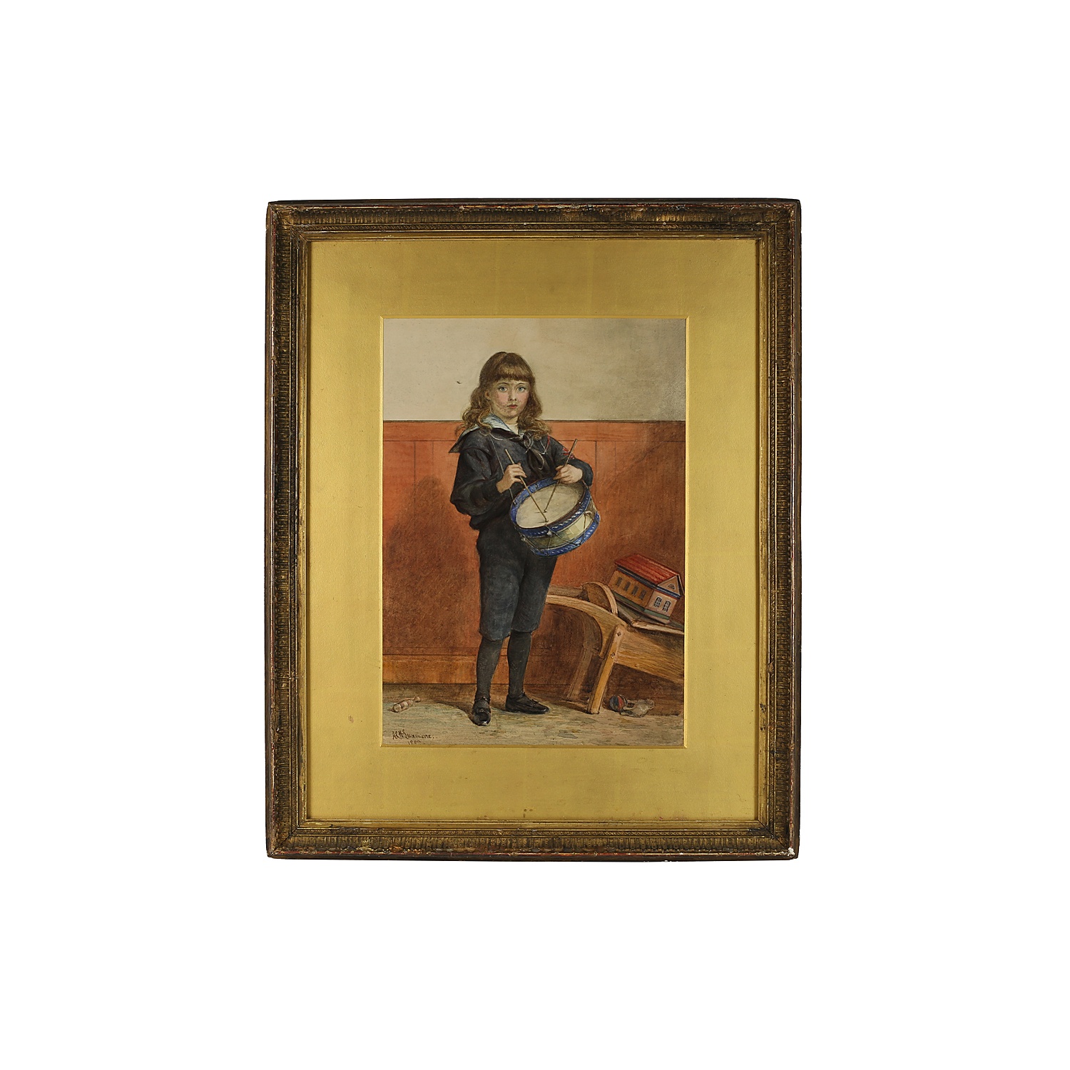 WATERCOLOUR VICTORIAN CHILD WITH DRUM SIGNED LUXMOOR (?) 1891 IN A GILT FRAME GOLD MOUNT 20/i X 15/i