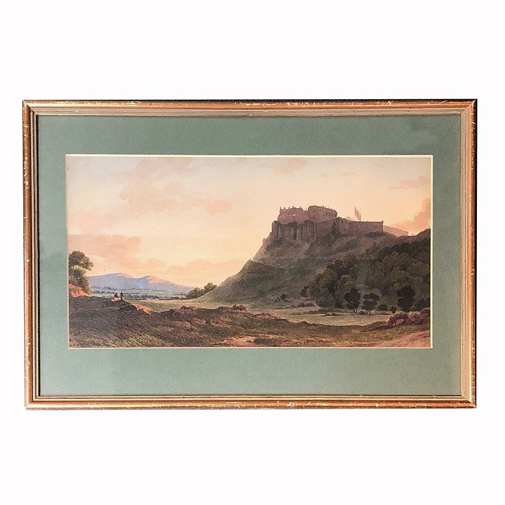WATERCOLOUR VIEW OF STIRLING CASTLE IN A GILT FRAME 9/i X 19/i WITH A GREEN MOUNT
