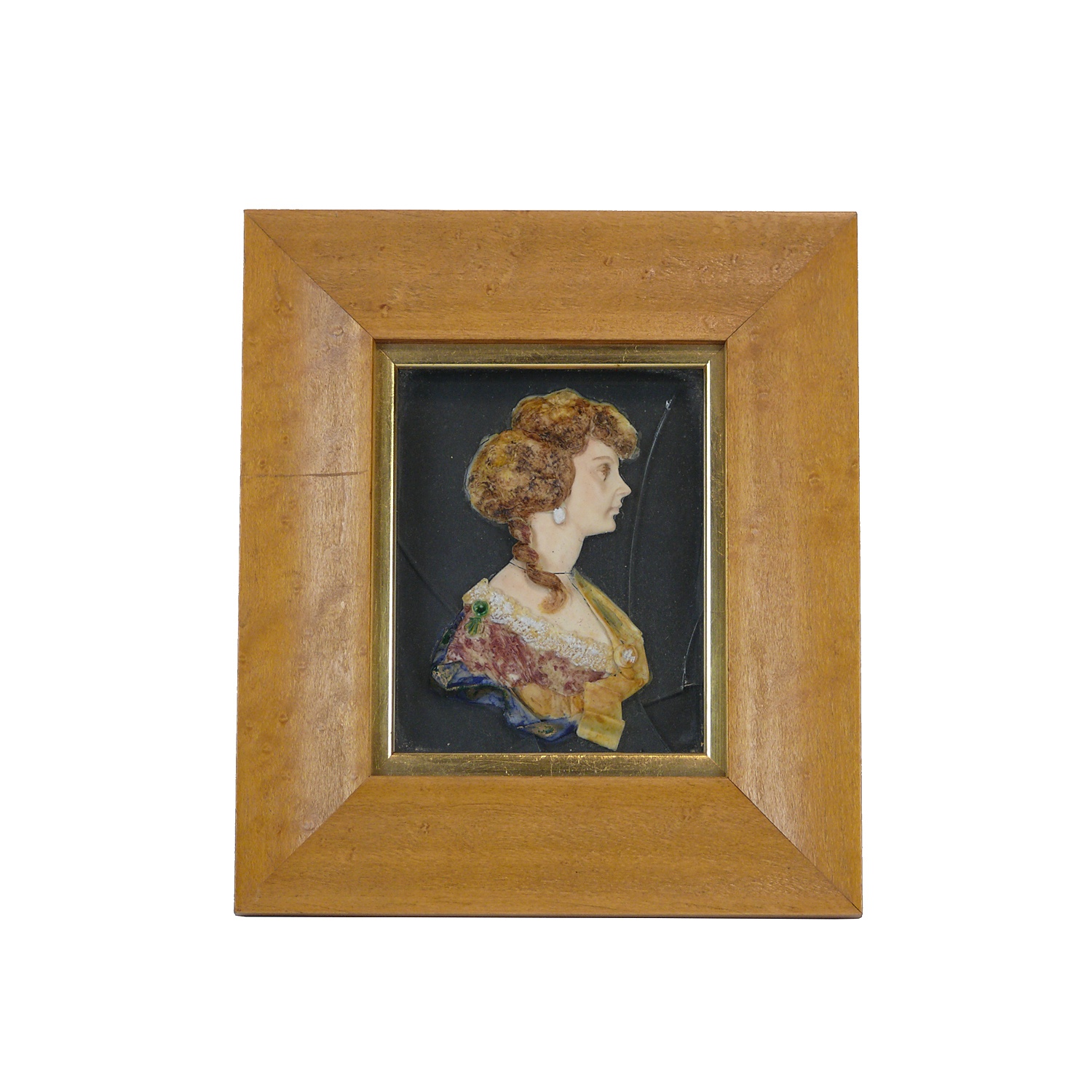 WAX RELIEF PORTRAIT OF A LADY IN AN 18THC STYLE BY LESLIE RAY (20THC) IN A MAPLE VENEER FRAME 5/i X 4/i (DAMAGED GLASS BACKING)