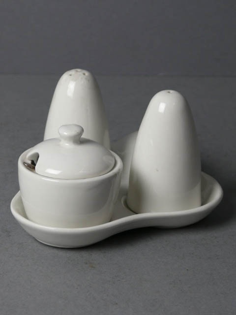 WEDGWOOD PLAIN WHITE CHINA CONDIMENT SET SALT, PEPPER AND COVERED MUSTARD POT WITH SPOON ON TRAY