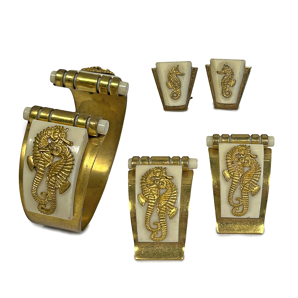 ART DECO 1930's JEAN PAINLEVE WHITE BAKELITE AND GOLD SEAHORSE DESIGN SET COMP. OF BANGLE, PAIR OF DRESS CLIPS AND PAIR OF EARRINGS
