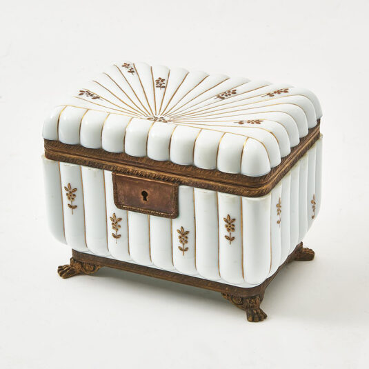 WHITE ART NOUVEAU RIBBED GLASS BOX / CASKET WITH GILT DECORATION ORMOLU MOUNTS AND LION PAW FEET BOHEMIAN CIRCA 1910 12.5 CM HIGH 15 CM WIDE 10 CM DEEP