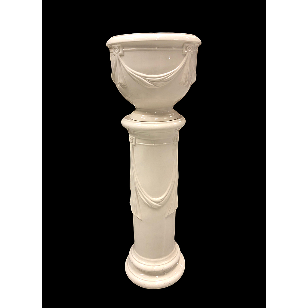 WHITE CHINA JARDINIERE / PLANTER WITH SWAG RELIEF PATTERN ON MATCHING PEDESTAL BASE 92 CM HIGH 32 CM DIAM