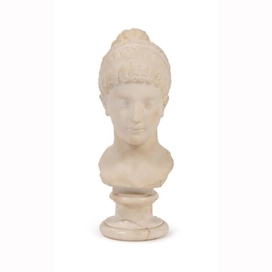 WHITE MARBLE BUST OF A YOUNG WOMAN IN NEOCLASSICAL STYLE PORTRAYED WITH TIED COILED HAIR ON SOCLE BASE FRENCH 19TH CENT 33 CM HIGH
