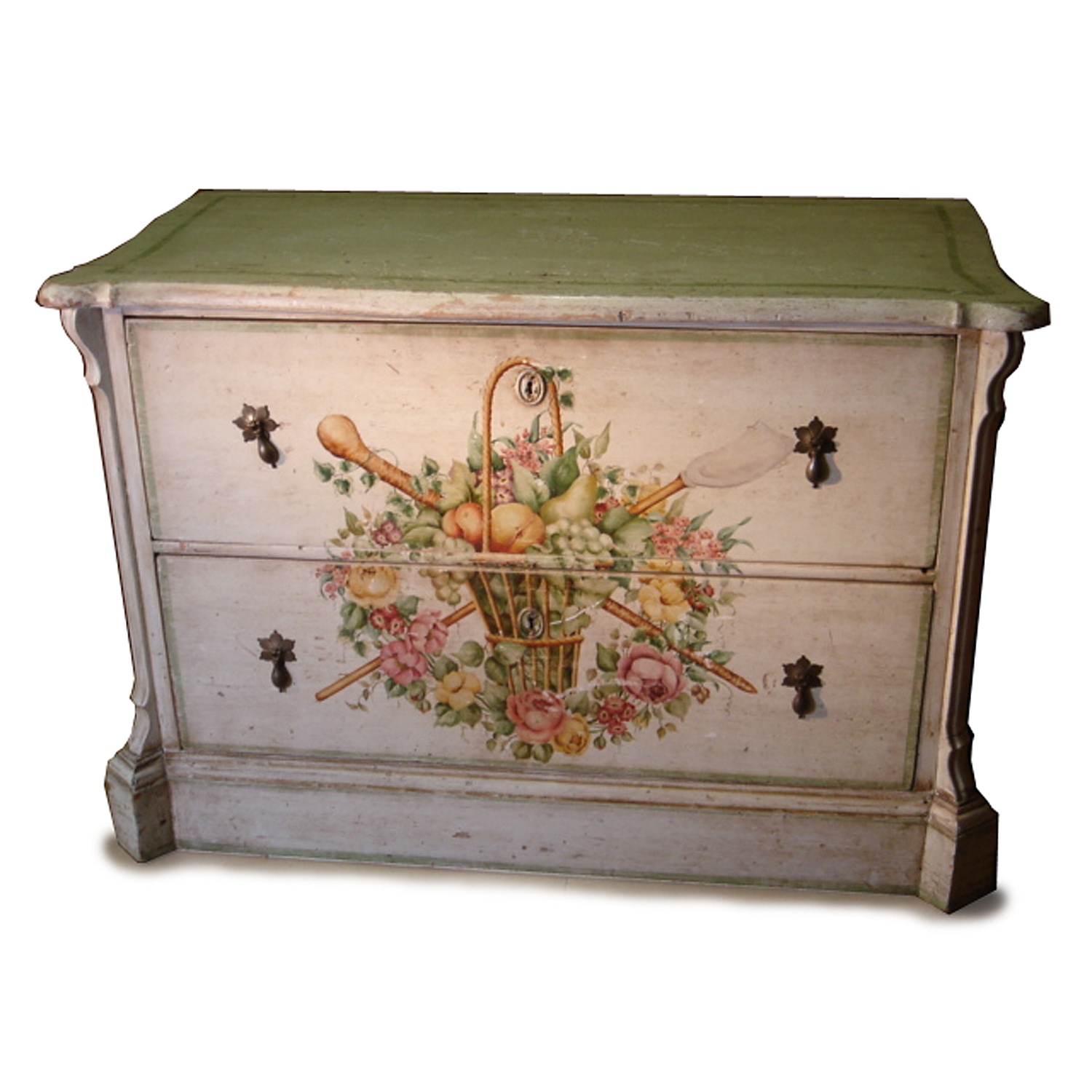 WHITE PAINTED CHEST OF DRAWERS WITH FLORAL BASKET FRONT TWO DRAWER 72 CM HIGH 103 CM WIDE 52 CM DEEP