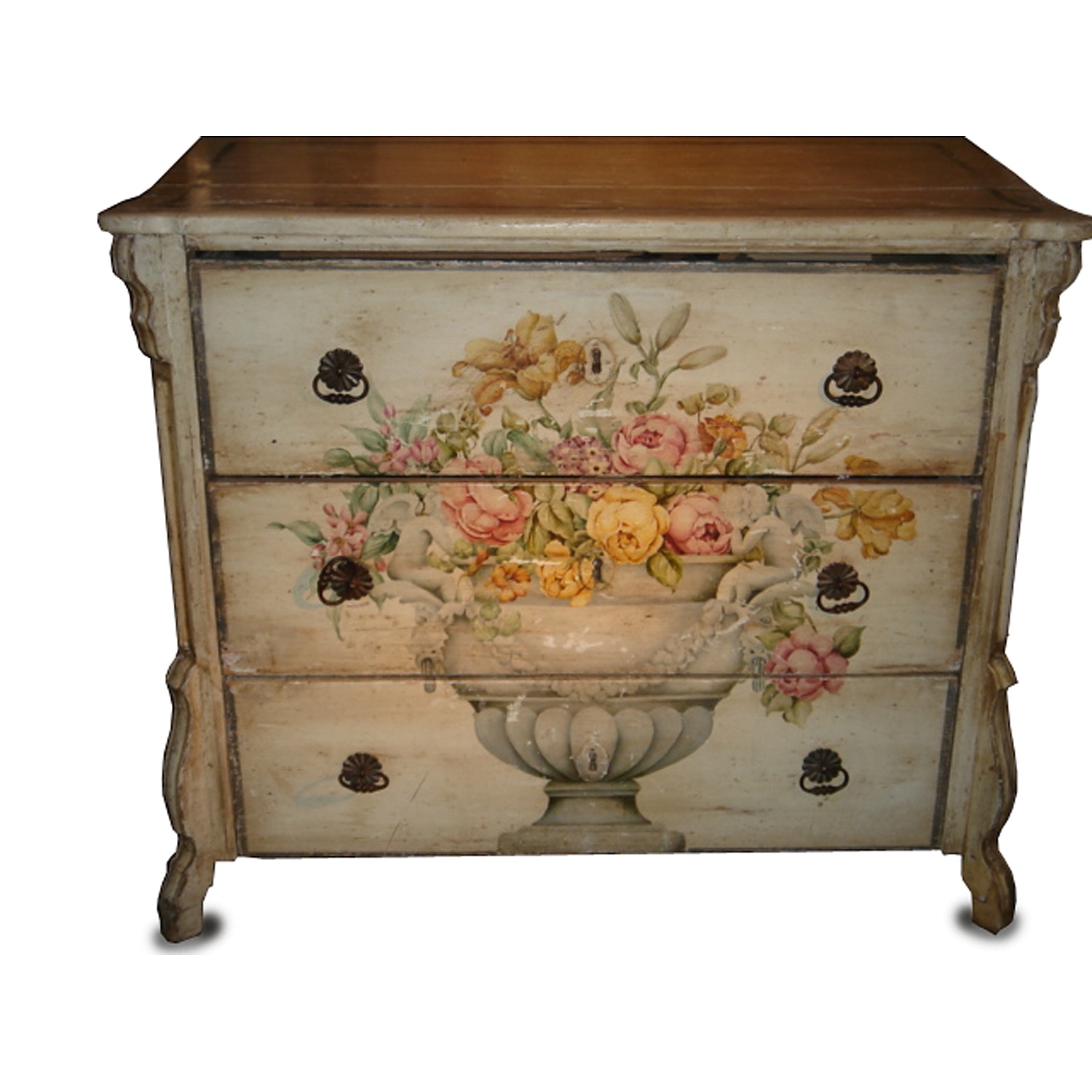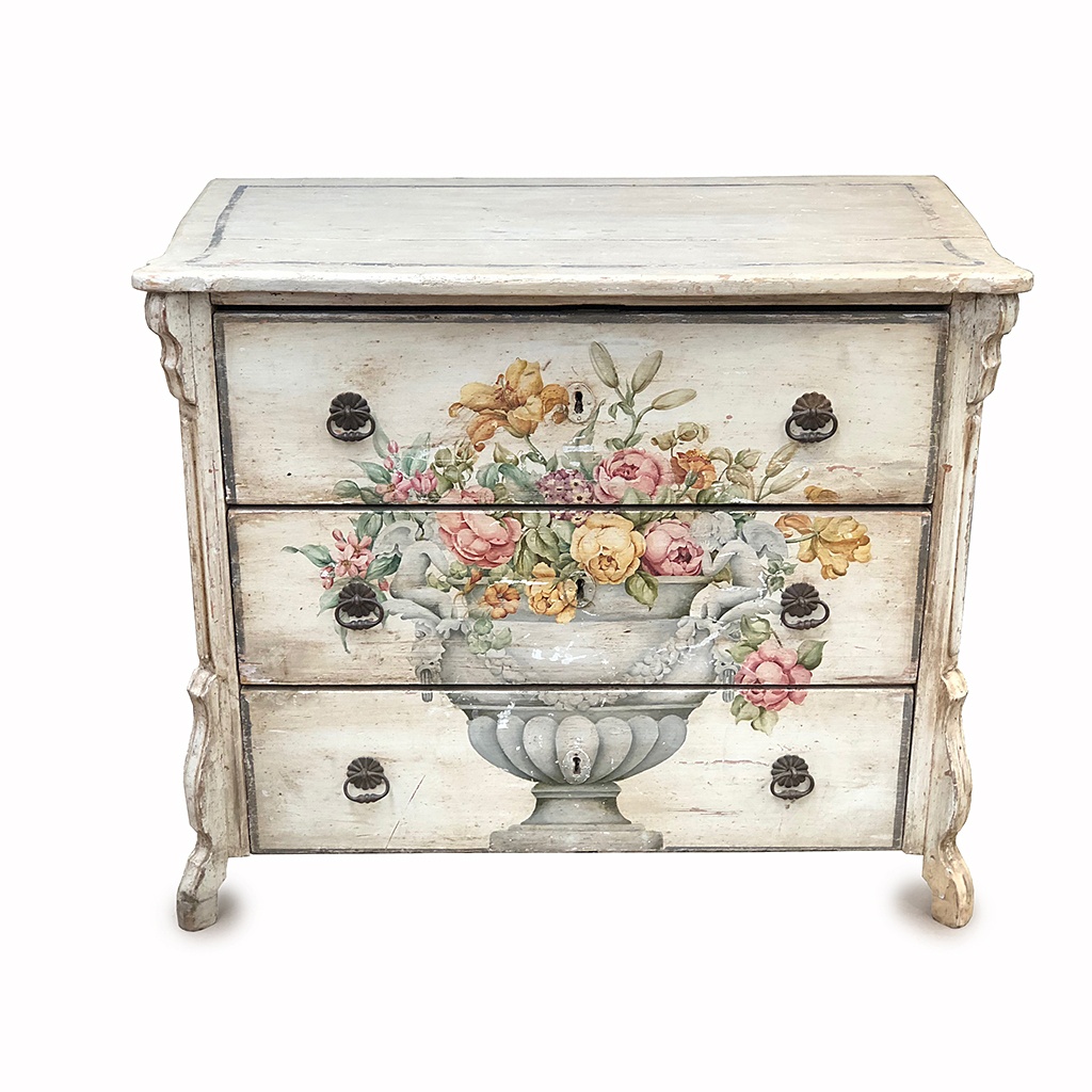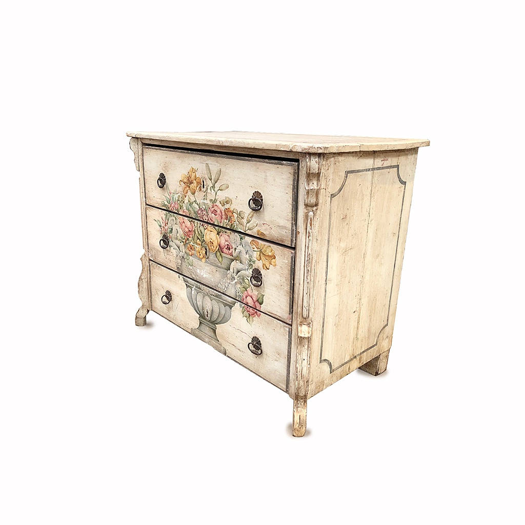 WHITE PAINTED CHEST OF DRAWERS WITH FLORAL URN FRONT THREE DRAWER 81 CM HIGH 97 CM WIDE 54 CM DEEP