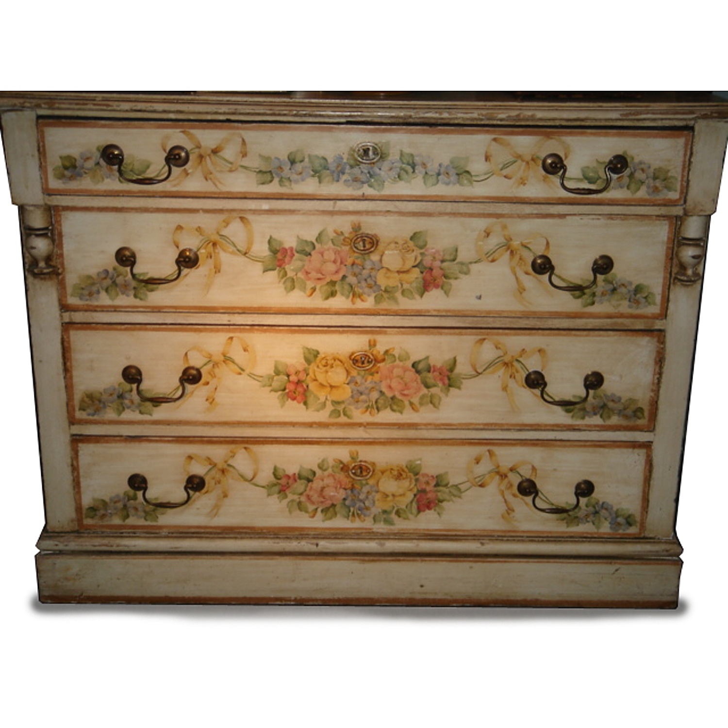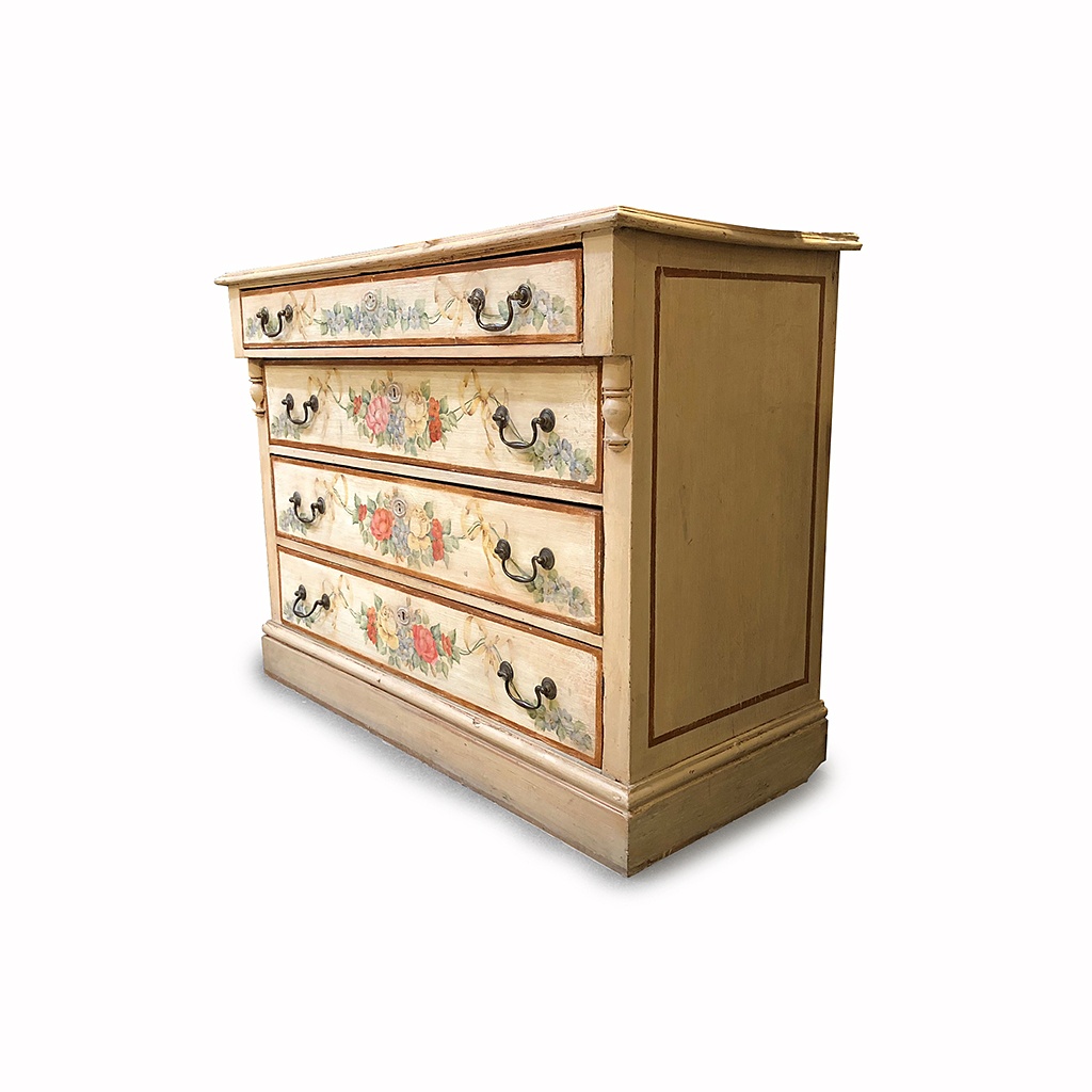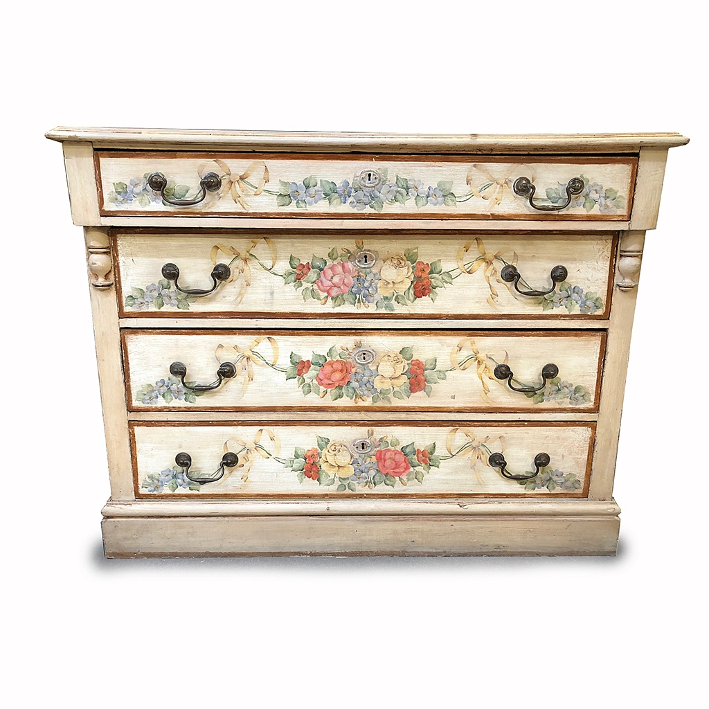 WHITE PAINTED FOUR DRAWER CHEST OF DRAWERS FLORAL GARLANDS ON EACH DRAWER 85 CM HIGH 110 CM WIDE 53 CM DEEP