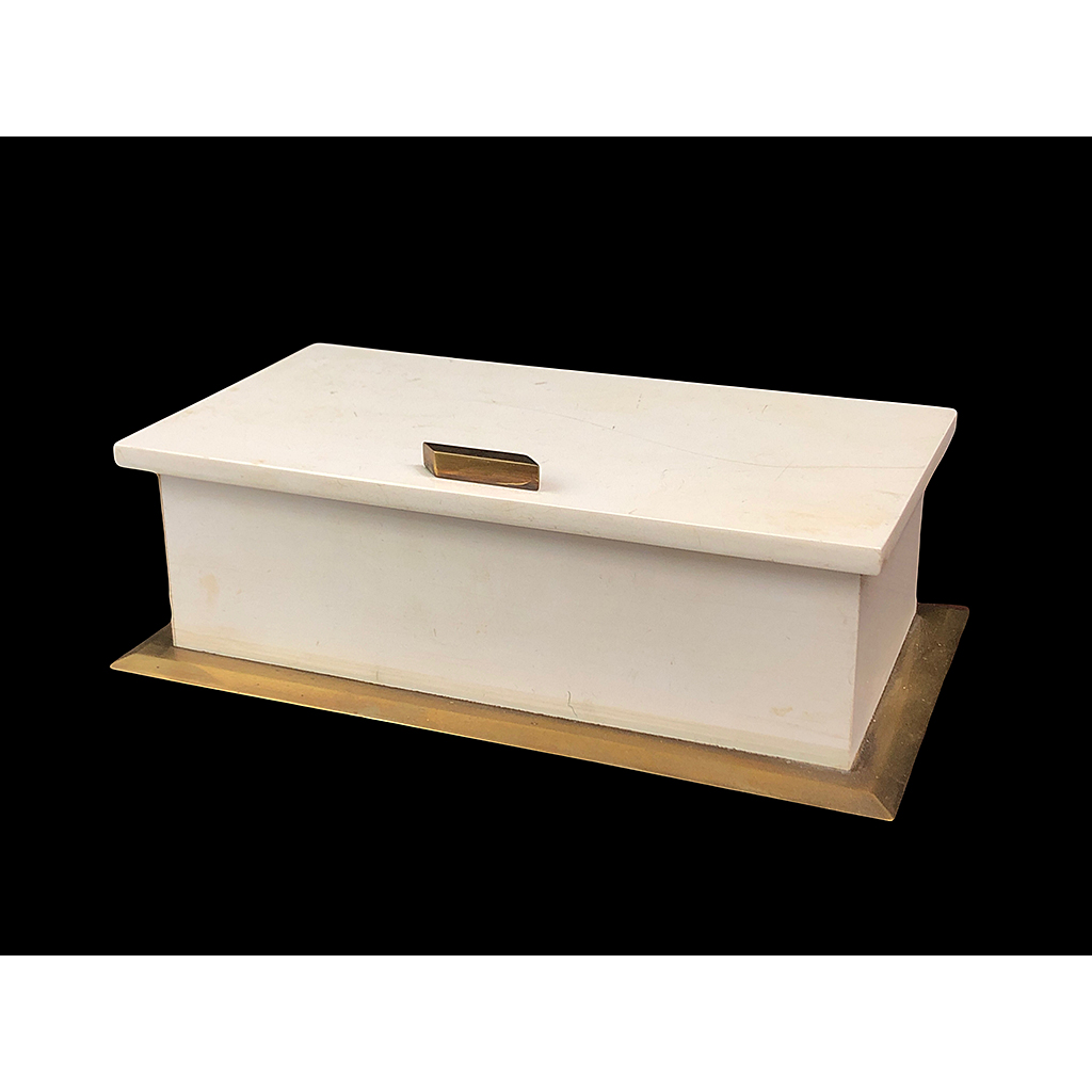 WHITE PLASTIC CIGARETTE BOX WITH BRASS TRIM 20 CM LONG / 11 CM DEEP / 6CM HIGH