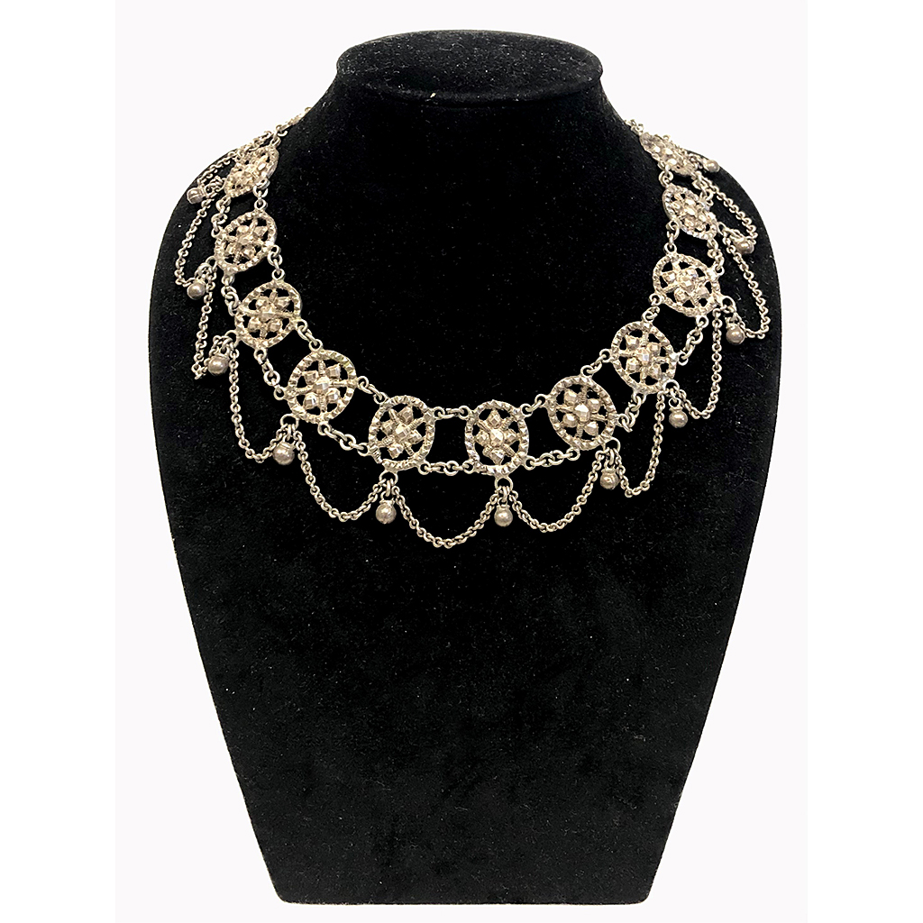 WIDE DECORATIVE CUT STEEL NECKLACE WITH OVAL FLORAL LINKS AND CHAIN SWAGS