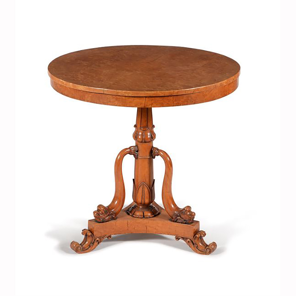 WILLIAM IV SMALL CIRCULAR CENTRE TABLE BIRDS EYE MAPLE CARVED TRICORN DOLPHIN BASE CIRCA 1835 73 CM HIGH 75 CM DIAM