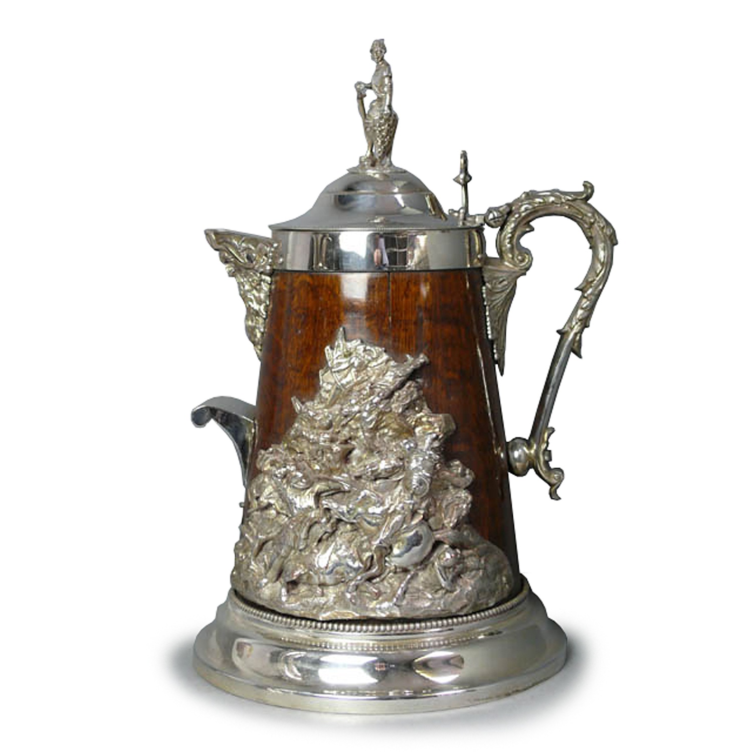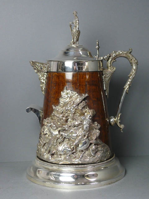 WOOD MILITARY ALE JUG WITH ORNATE SILVER DECORATIVE RELIEF SILVER LID WITH SOLDIER FINIAL AND SILVER BASE AND HANDLE 46 CM HIGH