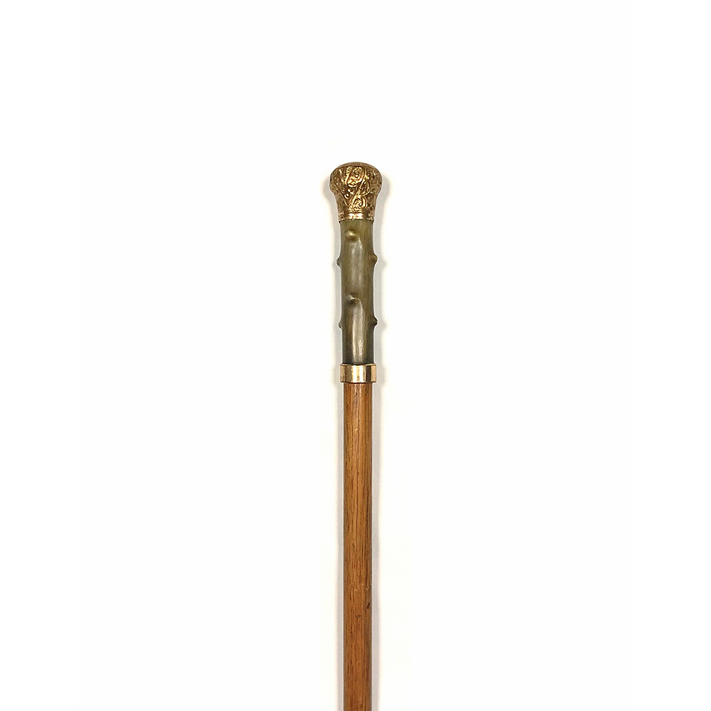 WOOD WALKING CANE / STICK WITH GOLD BAND AND GOLD DECORATIVE TOP 85 CM LONG