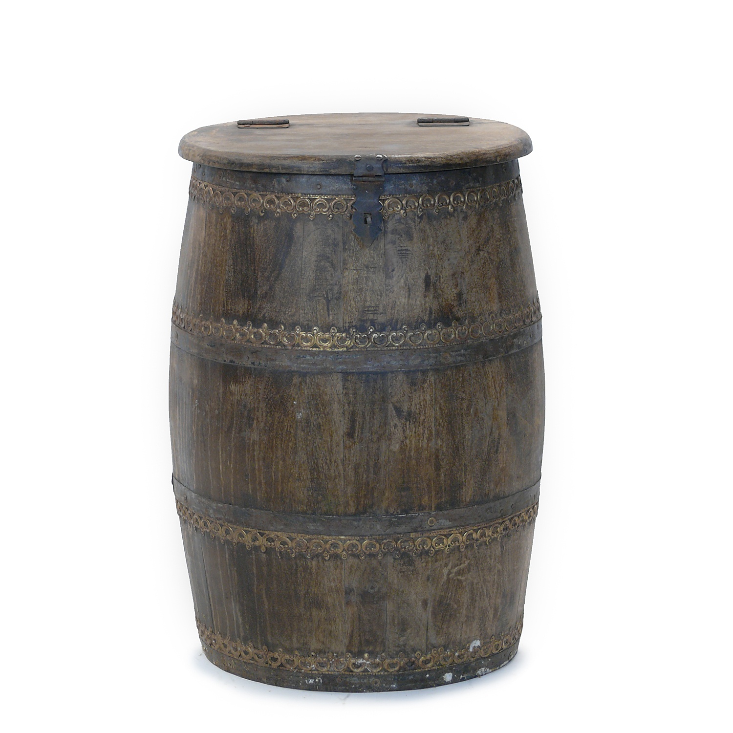 WOODEN BARREL SHAPED STOOL WITH FANCY BRASS BANDING AND HINGED LID 54 CM HIGH (X6)